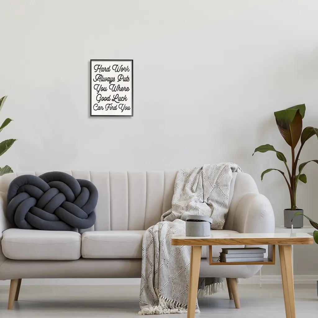 Add dimension to any room with our textured Framed Giclee Artwork. Our framed artwork is securely mounted into a 1.5-inch thick wood grain frame and ready to hang. Frames are available in three alluring styles: black, gray farmhouse and white. In addition, you should check out our oversized options if you want a statement piece. Stupell Wall Art is made in the USA.Features: Dimensions: 11 x 1.5 x 14 FramedFramed Giclee Sizes Include Standard: 11 x 1.5 x 14 Large: 16 x 1.5 x 20 Oversized: 24 x 1.5 x 30Wall Art is Ready to Hang - No Installation or Hardware Needed. For Easy Set Up Lean or Layer Artwork on Shelf or Against Wall.Our giclée prints are carefully mounted on a durable MDF backing, and then perfectly finished in a 1.5 inch thick woodgrain frame. Mounted frame colors include black, gray farmhouse and white. Made In USA.Artwork Relates To: Phrase, Inspirational, Motivational, Hard Work Always Puts You Where Good Luck Can Find YouDesign by Lil' Rue