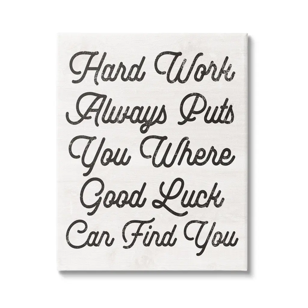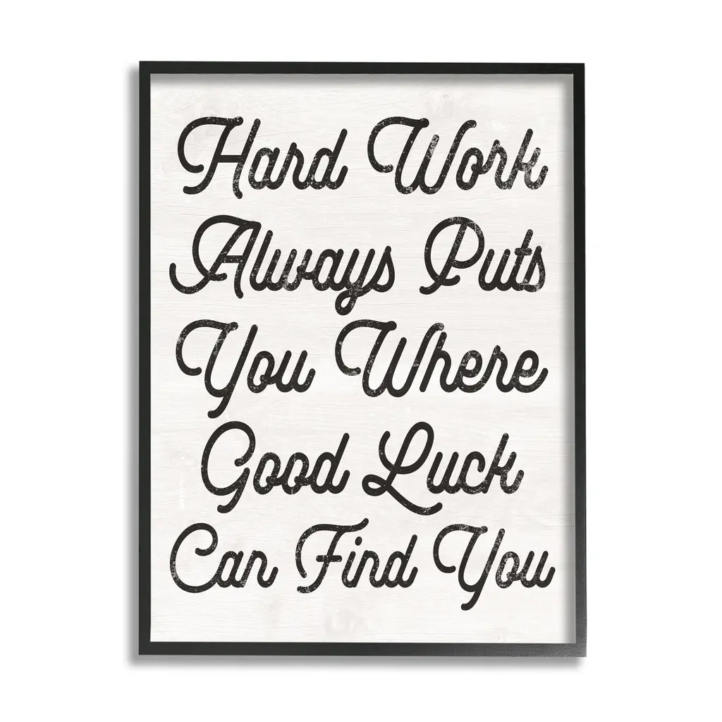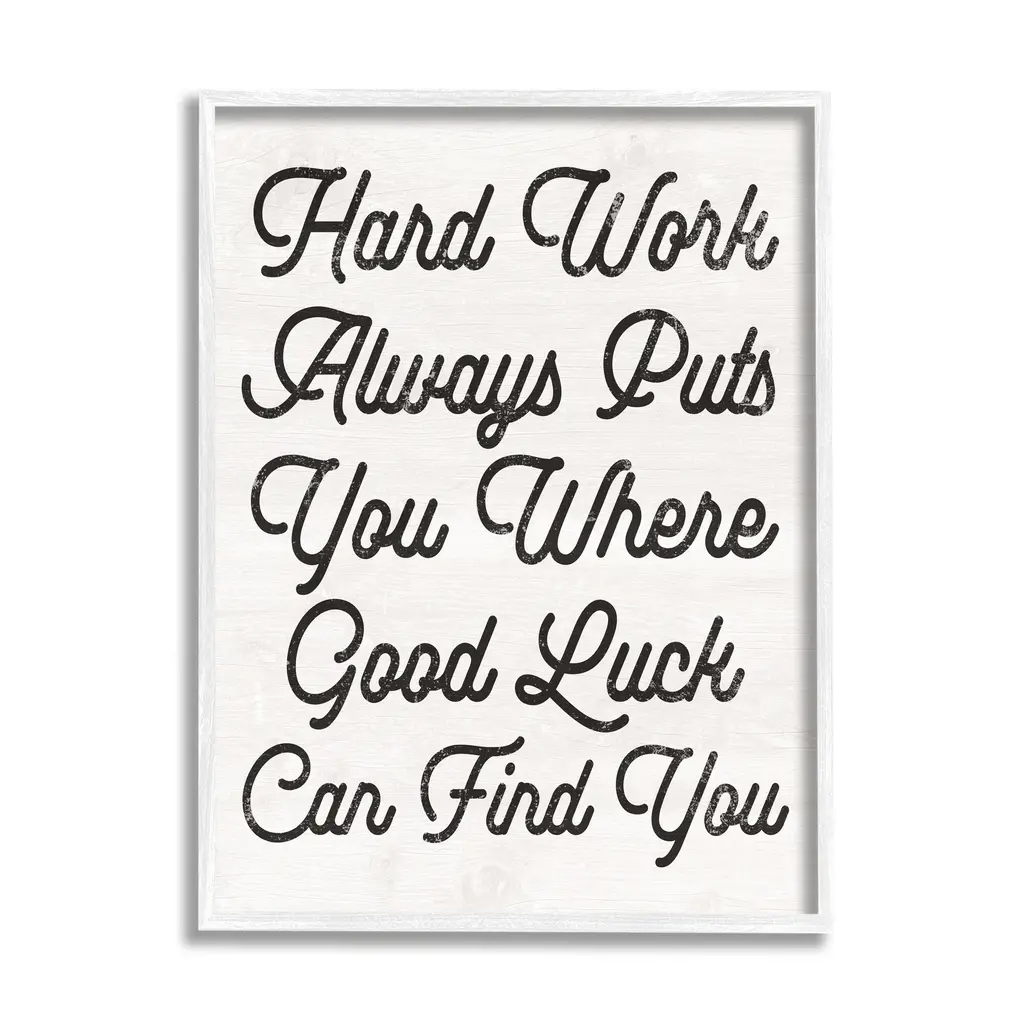 Add dimension to any room with our textured Framed Giclee Artwork. Our framed artwork is securely mounted into a 1.5-inch thick wood grain frame and ready to hang. Frames are available in three alluring styles: black, gray farmhouse and white. In addition, you should check out our oversized options if you want a statement piece. Stupell Wall Art is made in the USA.Features: Dimensions: 11 x 1.5 x 14 FramedFramed Giclee Sizes Include Standard: 11 x 1.5 x 14 Large: 16 x 1.5 x 20 Oversized: 24 x 1.5 x 30Wall Art is Ready to Hang - No Installation or Hardware Needed. For Easy Set Up Lean or Layer Artwork on Shelf or Against Wall.Our giclée prints are carefully mounted on a durable MDF backing, and then perfectly finished in a 1.5 inch thick woodgrain frame. Mounted frame colors include black, gray farmhouse and white. Made In USA.Artwork Relates To: Phrase, Inspirational, Motivational, Hard Work Always Puts You Where Good Luck Can Find YouDesign by Lil' Rue