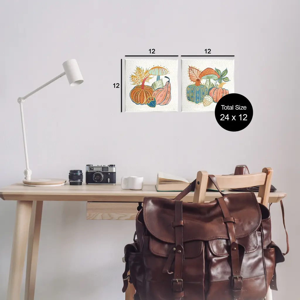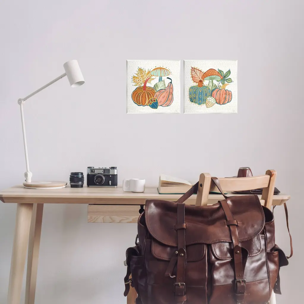 Fill any space with Stupell Wall Art Sets. Our wall plaques start as high-quality lithograph prints mounted on durable 0.5-inch thick MDF wood. Each piece is hand finished and comes with a fresh layer of white foil on the sides to give it a crisp, clean look. Plaques arrive ready to hang without installation and come with removable plastic corners to keep them from damage in transit. Stupell Wall Art is made in the USA.Features: Dimensions: 2 Piece Set, Each Panel is 12 x 0.5 x 12 InchesWall Art is Ready to Hang with Hardware Free Hanging. No Installation required. For Easy Set Up Lean or Layer Artwork on Shelf or Against Wall. Artwork is Permently Fixed into the Frame.All of our wall plaques start off as high quality lithograph prints that are then mounted on durable 0.5 inch thick MDF wood. Each piece is hand finished and comes with a fresh layer of foil on the sides to give it a crisp clean look. Made In USA.Artwork Relates To: Fall, Autumnal, Seasonal, Harvest, Gourd, MushroomDesign by Dina June