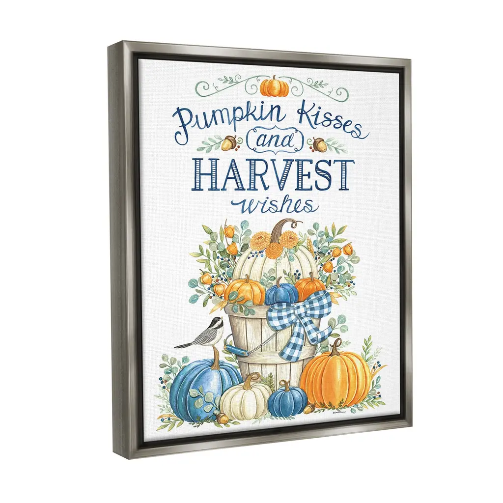 Elevate your home or office to the next level with Stupell Framed Floating Canvas Wall Art. Our premium hand-stretched canvas is mounted securely into a sturdy lightweight frame. The museum-style gap between the wrapped canvas and the box frame gives the illusion of floating artwork. Stupell Wall Art is made in the USA.Features: Dimensions: 17 x 1.7 x 21 Frame, 16 x 1.5 x 20 Canvas ArtFloating Frame Canvas Products are available in sizes 17"x21" and 25"x31". All Floating Frame Canvas Products have a 1.7" Depth.Wall Art is Ready to Hang with Hardware Free Hanging. No Installation required. For Easy Set Up Lean or Layer Artwork on Shelf or Against Wall. Artwork is Permently Fixed into the Frame.Our elevated 1.7" Thick Floating Frame is the perfect complement to our canvas style Wall Art. We use only the highest quality inks in house with industry leading printing solutions. Canvas is hand stretched over a durable wood foundation and then mounted securly into a Modern Box Frame. Made in the USA.Artwork Relates To: Nature, Country, Harvest, Plant, Fall, Autumn, Pumpkin, Phrase, Pattern, Acorn, Bird, Rustic, Pumpkin Kisses and Harvest WishesDesign by Deb Strain