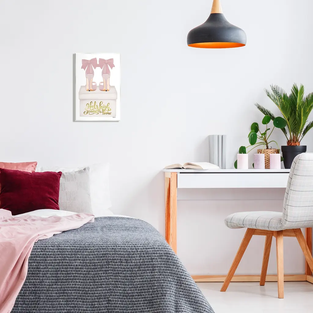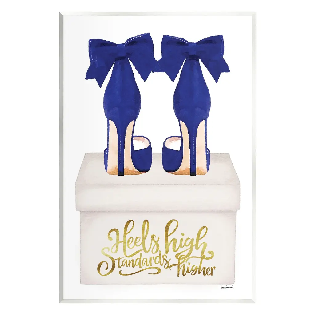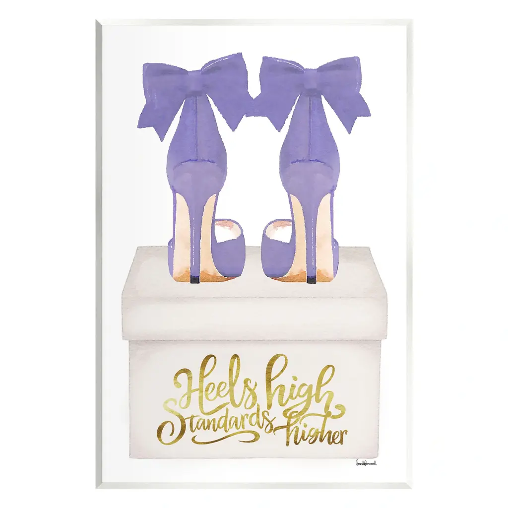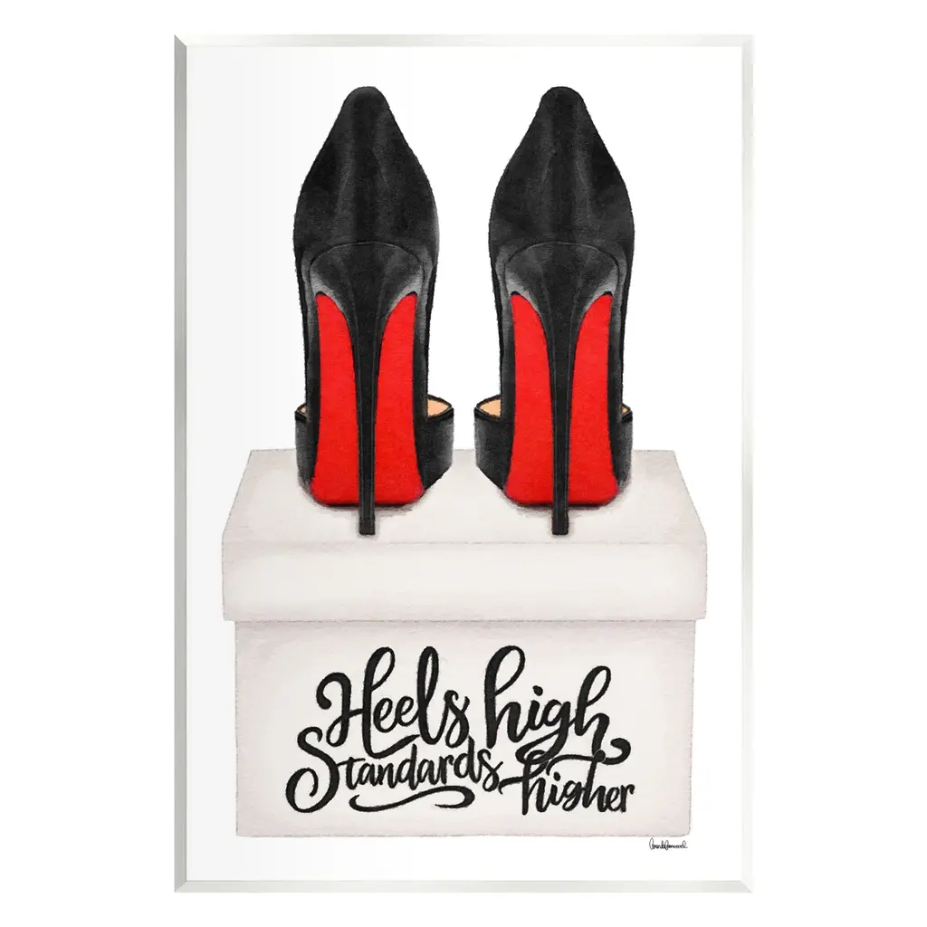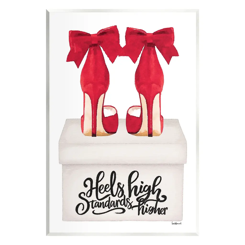 Our wall plaques start as high-quality lithograph prints mounted on durable 0.5-inch thick MDF wood. Each piece is hand finished and comes with a fresh layer of white foil on the sides to give it a crisp, clean look. Plaques arrive ready to hang without installation and come with removable plastic corners to keep them from damage in transit. Wall Art is made in the USA.Features: Dimensions: 10 x 0.5 x 15 InchesWall Plaque Sizes Include Standard: 10 x 0.5 x 15 Oversized: 13 x 0.5 x 19Wall Art is Ready to Hang with Hardware Free Hanging. No installation required. For Easy Set Up Lean or Layer Artwork on Shelf or Against Wall.All of our wall plaques start off as high quality lithograph prints that are then mounted on durable 0.5 inch thick MDF wood. Each piece is hand finished and comes with a fresh layer of foil on the sides to give it a crisp clean look. Made In USA.Artwork Relates To: High Heel, Shoe, Glam, Fashion, Heels High Standards HigherDesign by Amanda Greenwood