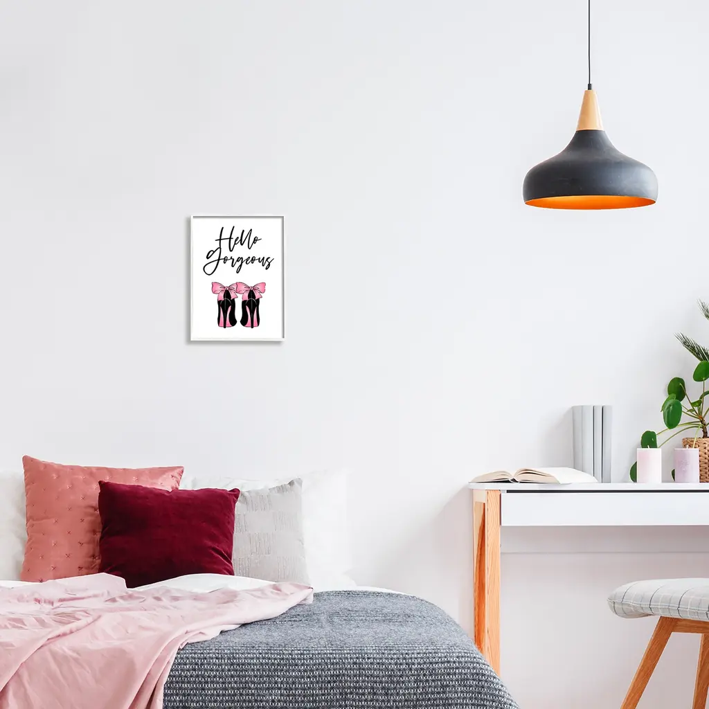 Add dimension to any room with our textured Framed Giclee Artwork. Our framed artwork is securely mounted into a 1.5-inch thick wood grain frame and ready to hang. Frames are available in three alluring styles: black, gray farmhouse and white. In addition, you should check out our oversized options if you want a statement piece. Stupell Wall Art is made in the USA.Features: Dimensions: 11 x 1.5 x 14 FramedFramed Giclee Sizes Include Standard: 11 x 1.5 x 14 Large: 16 x 1.5 x 20 Oversized: 24 x 1.5 x 30Wall Art is Ready to Hang - No Installation or Hardware Needed. For Easy Set Up Lean or Layer Artwork on Shelf or Against Wall.Our giclée prints are carefully mounted on a durable MDF backing, and then perfectly finished in a 1.5 inch thick woodgrain frame. Mounted frame colors include black, gray farmhouse and white. Made In USA.Artwork Relates To: Shoe, High Heel, Fashion, Glam, Bow, Hello GorgeousDesign by Martina Pavlova