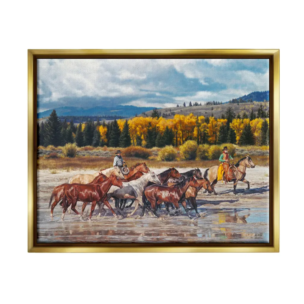 Elevate your home or office to the next level with Stupell Framed Floating Canvas Wall Art. Our premium hand-stretched canvas is mounted securely into a sturdy lightweight frame. The museum-style gap between the wrapped canvas and the box frame gives the illusion of floating artwork. Stupell Wall Art is made in the USA.Features: Dimensions: 18 x 1.7 x 18 Frame, 17 x 1.5 x 17 Canvas ArtFloating Frame Canvas Products are available in sizes 18"x18" and 25"x25". All Floating Frame Canvas Products have a 1.7" Depth.Wall Art is Ready to Hang with Hardware Free Hanging. No Installation required. For Easy Set Up Lean or Layer Artwork on Shelf or Against Wall. Artwork is Permently Fixed into the Frame.Our elevated 1.7" Thick Floating Frame is the perfect complement to our canvas style Wall Art. We use only the highest quality inks in house with industry leading printing solutions. Canvas is hand stretched over a durable wood foundation and then mounted securly into a Modern Box Frame. Made in the USA.Artwork Relates To: Person, Animal, Horse, Mammal, Cattle, Cow, Horseback Riding, Nature, Water, Equestrian, Painting, Wilderness, Herd, Countryside, Stream, Foliage, Fall, TreesDesign by Jimmy Dyer