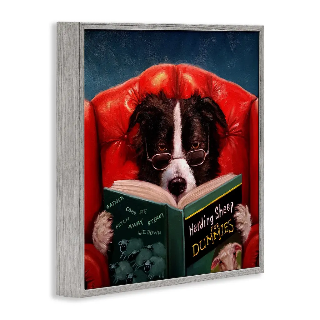 Update your home office with this whimsical art print showing a bespectacled barn dog lounging on a red chair while poring over a book titled 'Herding Sheep for Dummies'. Texturized brush strokes give this vivid giclee lithograph a more defined appearance, while the wood frame lends strength and rounds out the modern design. Features: Wall Art is Ready to Hang - No Installation or Hardware Needed. For Easy Set Up Lean or Layer Artwork on Shelf or Against Wall.Our giclée prints are carefully mounted on a durable MDF backing, and then perfectly finished in a 1.5 inch thick woodgrain frame. Frame colors include black, gray farmhouse and white. Made In USA.Artwork Ideal for any Living Room, Den, Entryway, Bedroom, Office, Kitchen or Bathroom.Design By Lucia Heffernan