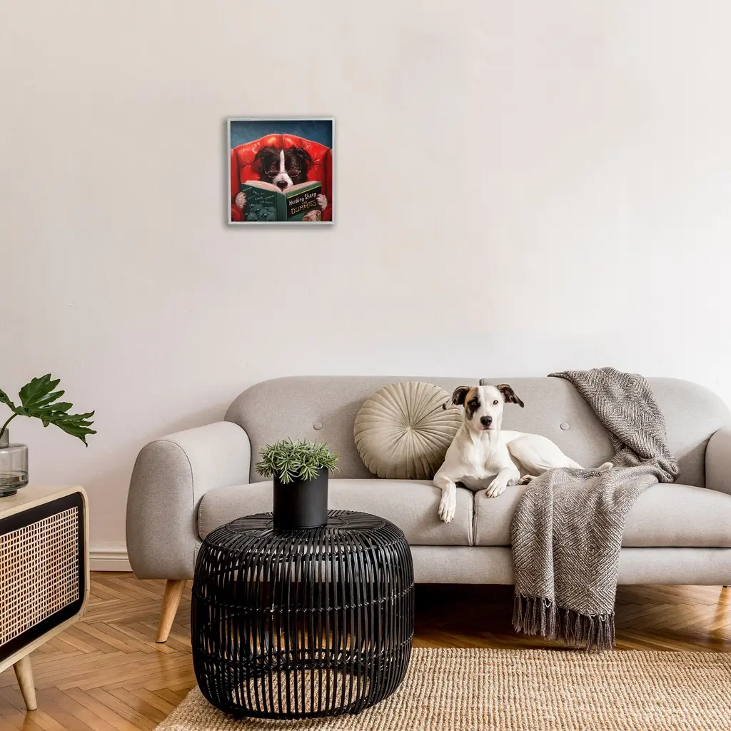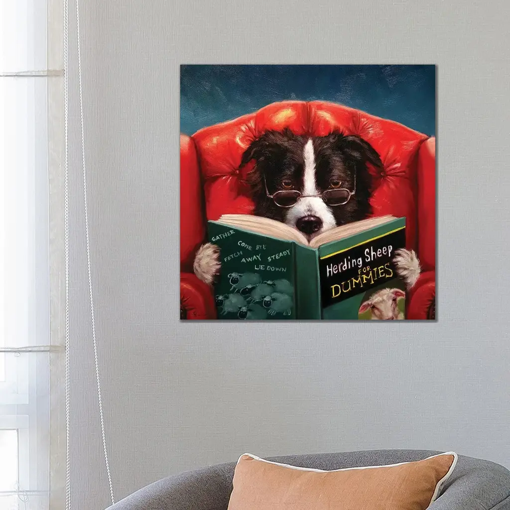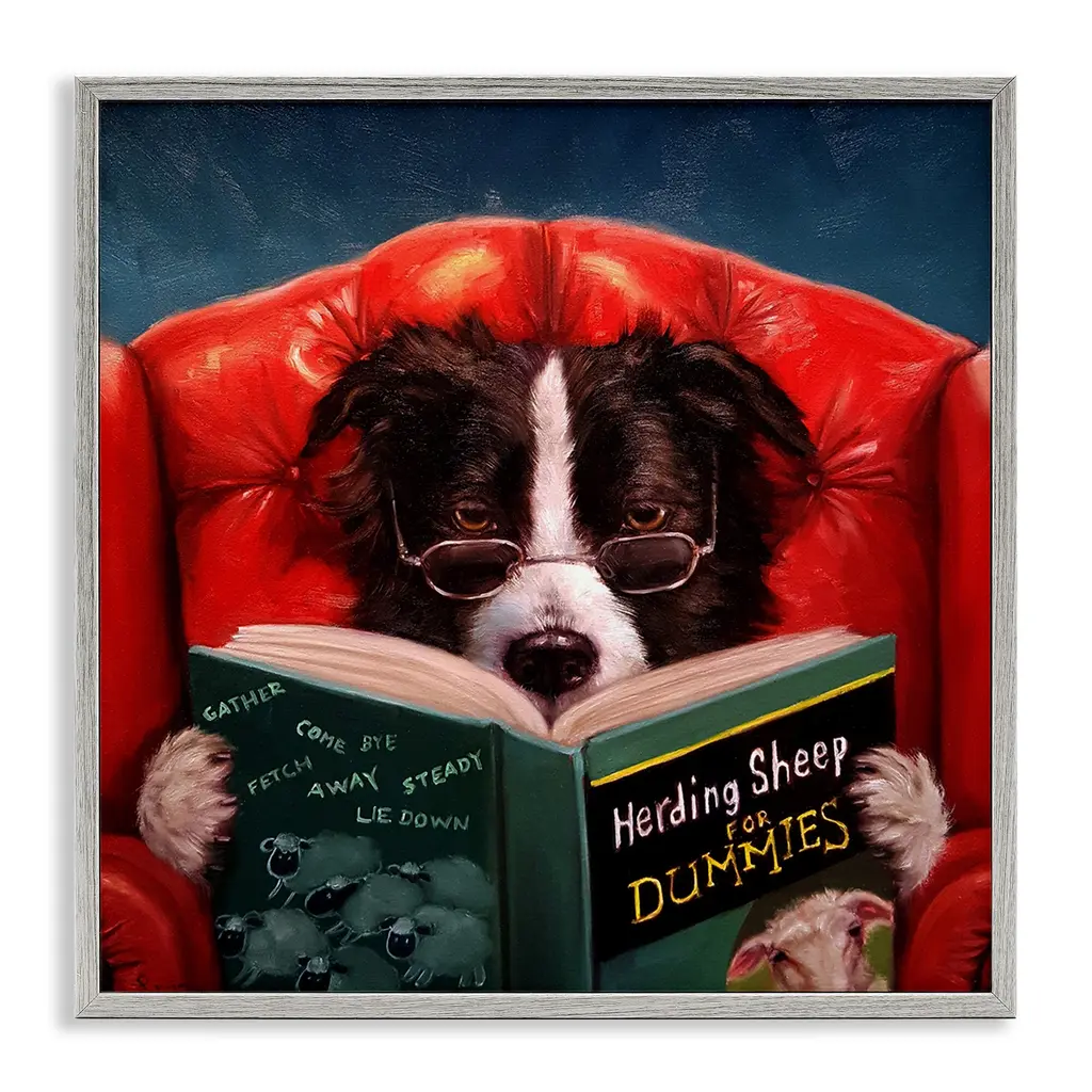 Update your home office with this whimsical art print showing a bespectacled barn dog lounging on a red chair while poring over a book titled 'Herding Sheep for Dummies'. Texturized brush strokes give this vivid giclee lithograph a more defined appearance, while the wood frame lends strength and rounds out the modern design. Features: Wall Art is Ready to Hang - No Installation or Hardware Needed. For Easy Set Up Lean or Layer Artwork on Shelf or Against Wall.Our giclée prints are carefully mounted on a durable MDF backing, and then perfectly finished in a 1.5 inch thick woodgrain frame. Frame colors include black, gray farmhouse and white. Made In USA.Artwork Ideal for any Living Room, Den, Entryway, Bedroom, Office, Kitchen or Bathroom.Design By Lucia Heffernan