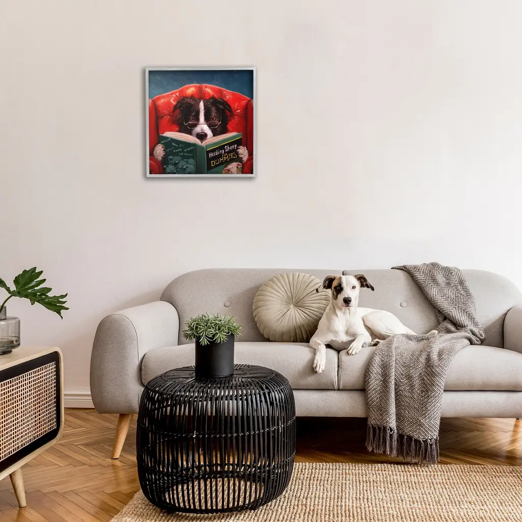 Update your home office with this whimsical art print showing a bespectacled barn dog lounging on a red chair while poring over a book titled 'Herding Sheep for Dummies'. Texturized brush strokes give this vivid giclee lithograph a more defined appearance, while the wood frame lends strength and rounds out the modern design. Features: Wall Art is Ready to Hang - No Installation or Hardware Needed. For Easy Set Up Lean or Layer Artwork on Shelf or Against Wall.Our giclée prints are carefully mounted on a durable MDF backing, and then perfectly finished in a 1.5 inch thick woodgrain frame. Frame colors include black, gray farmhouse and white. Made In USA.Artwork Ideal for any Living Room, Den, Entryway, Bedroom, Office, Kitchen or Bathroom.Design By Lucia Heffernan