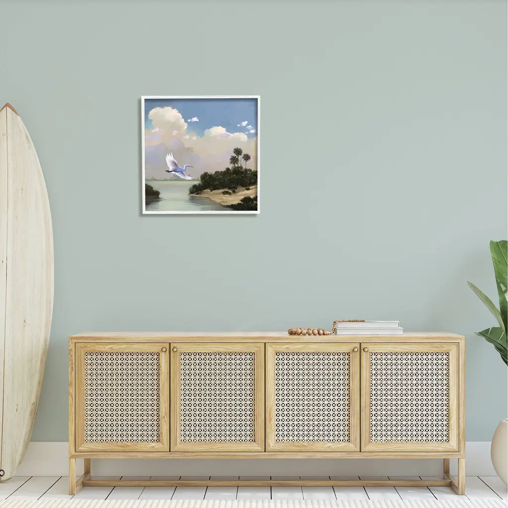 Our Framed Giclee Wall Art adds a touch of class to any space in your home or office. Frames are available in three alluring styles: black, gray farmhouse and white. Our textured artwork will add more depth and dimension to any space. Each piece is mounted with a 1.5 inch thick wood grain frame that is ready to hang! Looking for a statement piece? We have oversized artwork available. Room Type: Living Room, Den, Hallway, Office, Entryway, Study, Dining Room or Bedroom, Guest Room, Studio, Dorm or BoudoirFeatures: Dimensions: 12 x 1.5 x 12 FramedFramed Giclee Sizes Include Standard: 12 x 1.5 x 12 Large: 17 x 1.5 x 17 Oversized: 24 x 1.5 x 24Wall Art is Ready to Hang - No Installation or Hardware Needed. For Easy Set Up Lean or Layer Artwork on Shelf or Against Wall.Our giclée prints are carefully mounted on a durable MDF backing, and then perfectly finished in a 1.5 inch thick woodgrain frame. Mounted frame colors include black, gray farmhouse and white. Made In USA.Artwork Relates To: Animal, Bird, Flying, Waterfowl, Painting, Egret, Heron, Nature, Crane Bird, Shoreline, Water, Palm Tree, BeachDesign by Rick Novak