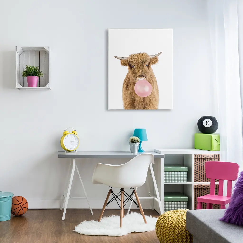 We create our stretched canvas to the highest standards. Using only the highest quality inks and canvas on Mimaki printers, we hand-cut and stretch each piece over a 1.5-inch thick wooden frame for hanging. As a result, the art comes ready to hang on the sturdy ledge with no installation required. Stupell Wall Art is made in the USA.Features: Dimensions: 16 x 1.5 x 20 InchesStretched Canvas Sizes Include Standard: 16 x 1.5 x 20 Large: 20 x 1.5 x 30 X-Large: 30 x 1.5 x 40 Oversized: 36 x 1.5 x 48Wall Art is Ready to Hang with Hardware Free Hanging. No installation required. For Easy Set Up Lean or Layer Artwork on Shelf or Against Wall.Our stretched canvas is created with the highest standards. We use only the highest quality inks and canvas on our in house Mimaki printers, and then hand cut and stretch each piece over a 1.5 inch thick wooden frame for hanging. Made In USA.Artwork Relates To: Animal, Mammal, Wildlife, Bubblegum, Cattle, Highland CattleDesign by Sisi and Seb
