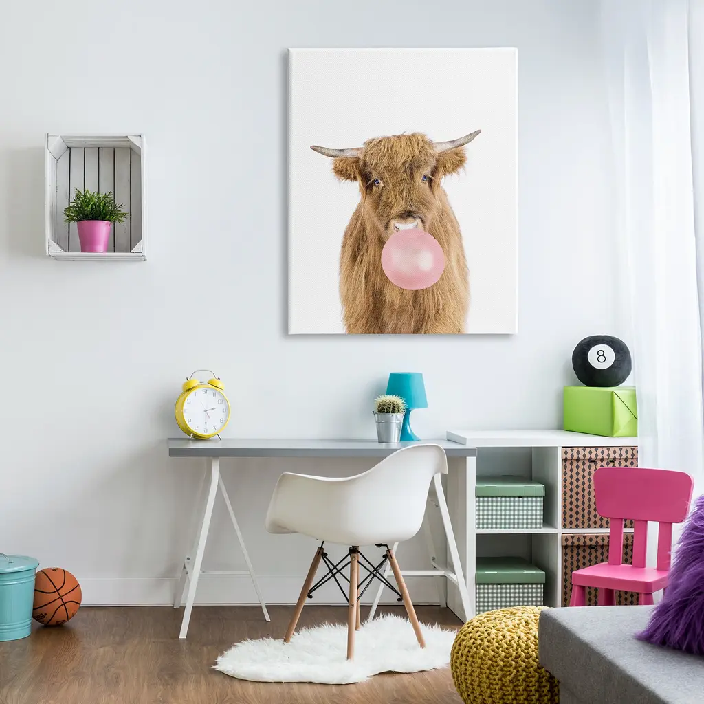 We create our stretched canvas to the highest standards. Using only the highest quality inks and canvas on Mimaki printers, we hand-cut and stretch each piece over a 1.5-inch thick wooden frame for hanging. As a result, the art comes ready to hang on the sturdy ledge with no installation required. Stupell Wall Art is made in the USA.Features: Dimensions: 16 x 1.5 x 20 InchesStretched Canvas Sizes Include Standard: 16 x 1.5 x 20 Large: 20 x 1.5 x 30 X-Large: 30 x 1.5 x 40 Oversized: 36 x 1.5 x 48Wall Art is Ready to Hang with Hardware Free Hanging. No installation required. For Easy Set Up Lean or Layer Artwork on Shelf or Against Wall.Our stretched canvas is created with the highest standards. We use only the highest quality inks and canvas on our in house Mimaki printers, and then hand cut and stretch each piece over a 1.5 inch thick wooden frame for hanging. Made In USA.Artwork Relates To: Animal, Mammal, Wildlife, Bubblegum, Cattle, Highland CattleDesign by Sisi and Seb