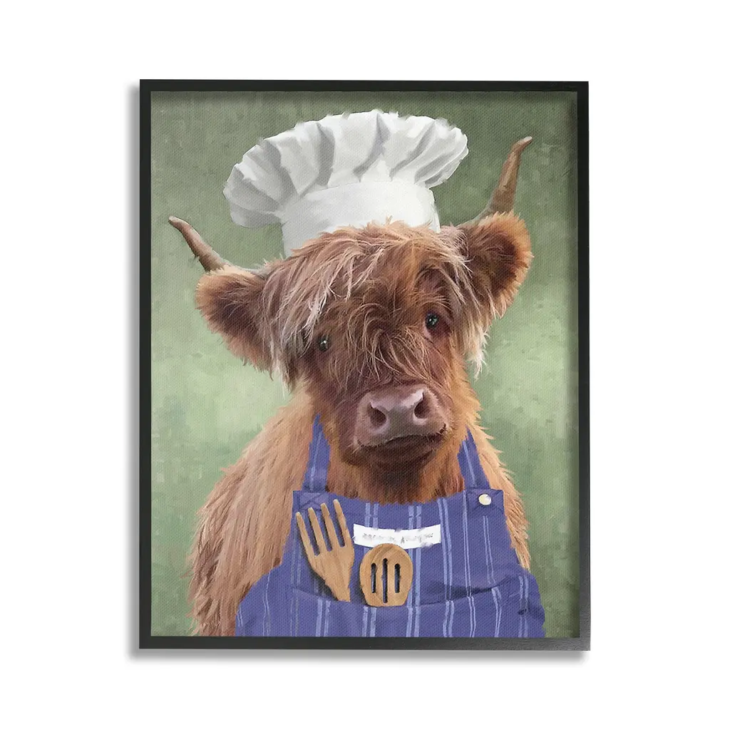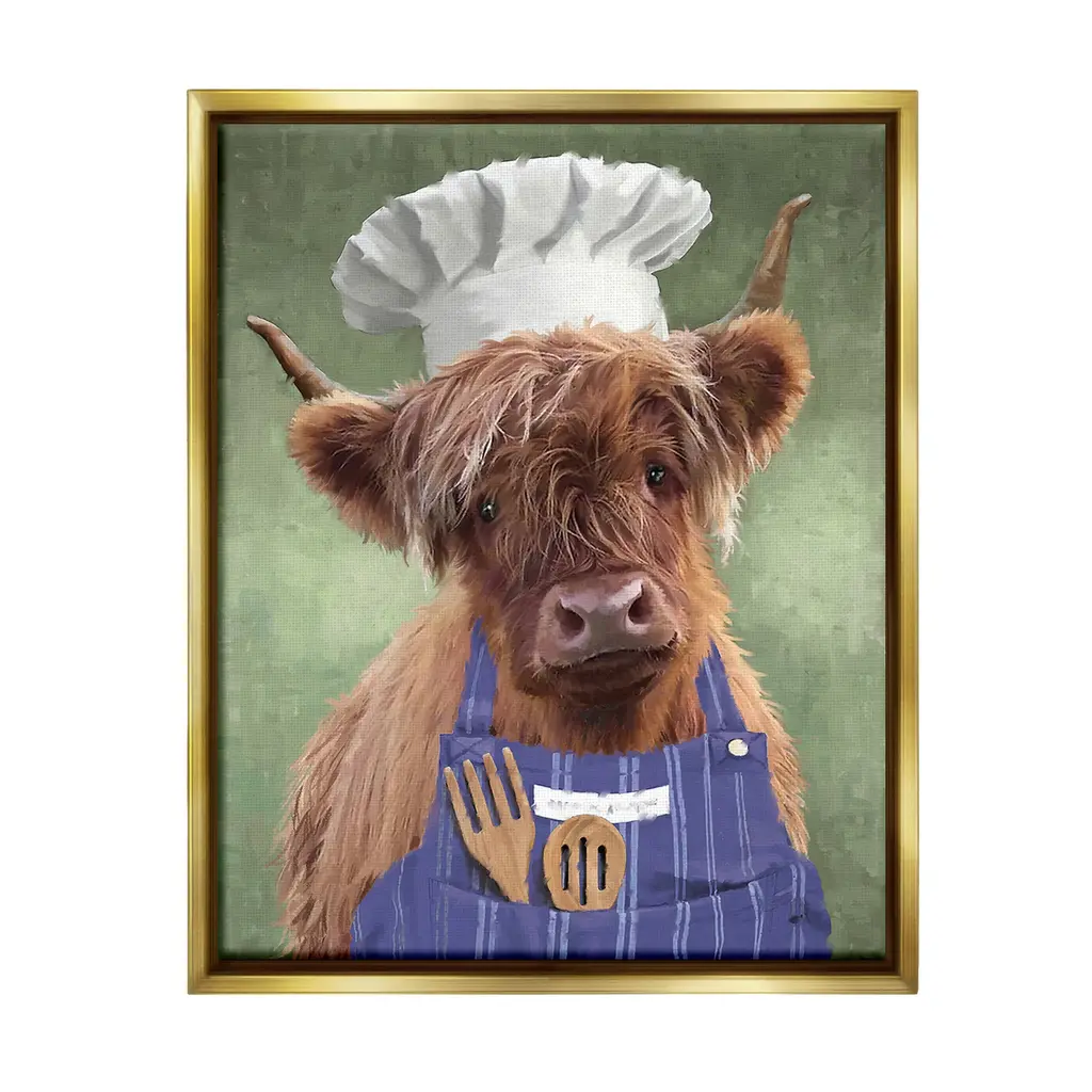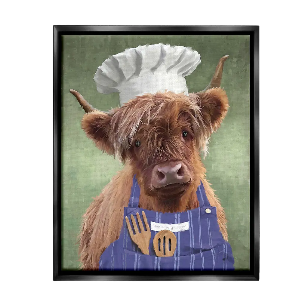 Elevate your home or office to the next level with Stupell Framed Floating Canvas Wall Art. Our premium hand-stretched canvas is mounted securely into a sturdy lightweight frame. The museum-style gap between the wrapped canvas and the box frame gives the illusion of floating artwork. Stupell Wall Art is made in the USA.Features: Dimensions: 17 x 1.7 x 21 Frame, 16 x 1.5 x 20 Canvas ArtFloating Frame Canvas Products are available in sizes 17"x21" and 25"x31". All Floating Frame Canvas Products have a 1.7" Depth.Wall Art is Ready to Hang with Hardware Free Hanging. No Installation required. For Easy Set Up Lean or Layer Artwork on Shelf or Against Wall. Artwork is Permently Fixed into the Frame.Our elevated 1.7" Thick Floating Frame is the perfect complement to our canvas style Wall Art. We use only the highest quality inks in house with industry leading printing solutions. Canvas is hand stretched over a durable wood foundation and then mounted securly into a Modern Box Frame. Made in the USA.Artwork Relates To: Animal, Mammal, Cattle, Farmhouse, Country, Chef, Portrait, Kitchen, CookingDesign by PSL Art