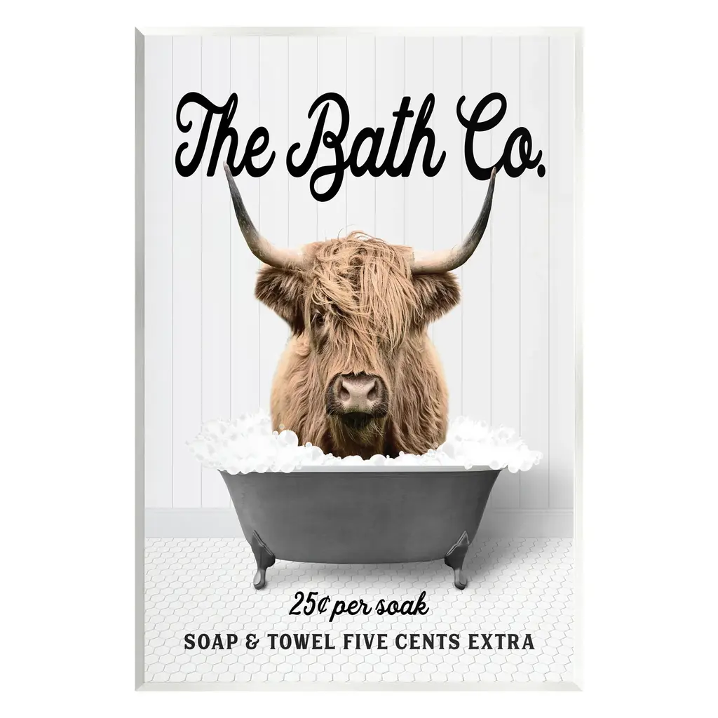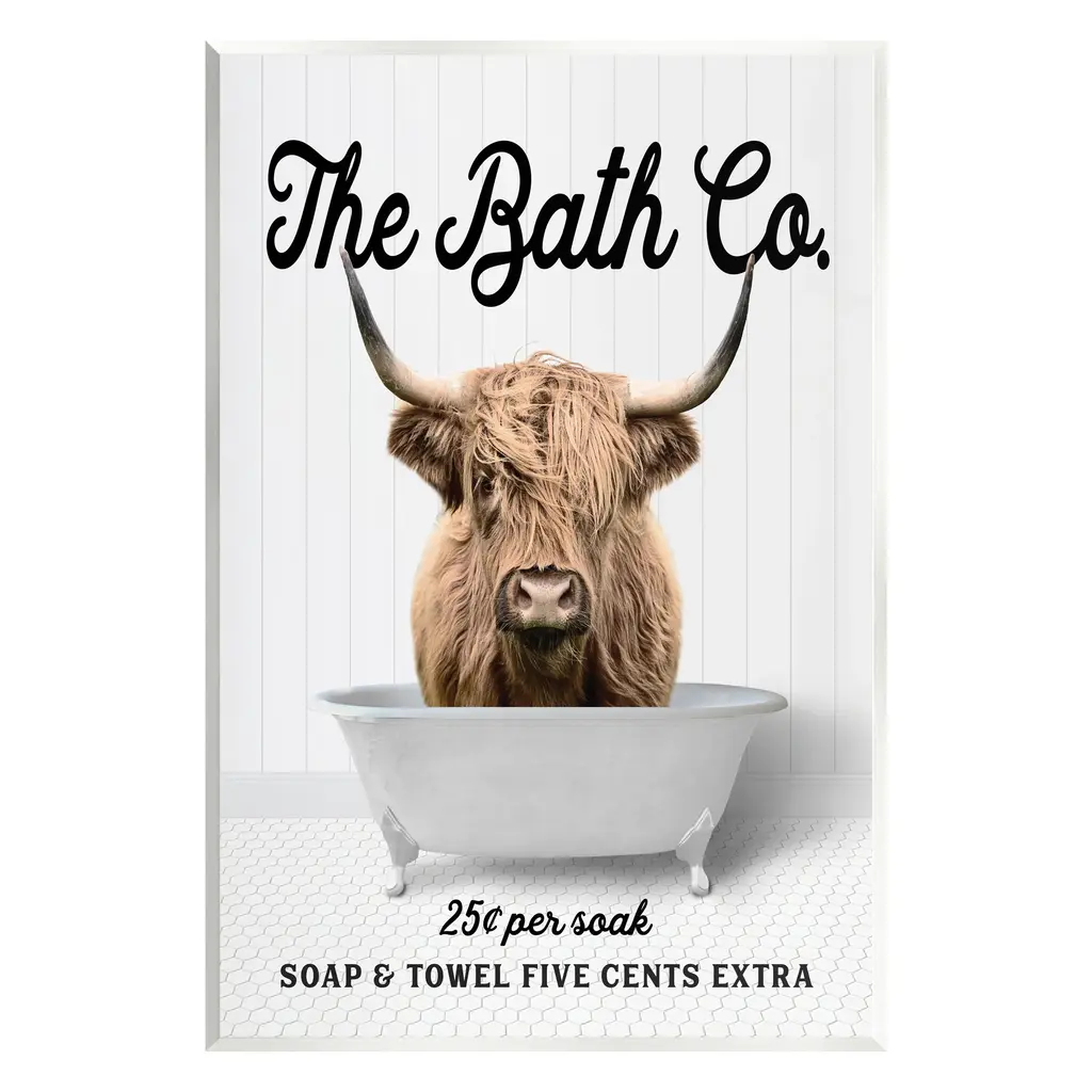Our wall plaques start as high-quality lithograph prints mounted on durable 0.5-inch thick MDF wood. Each piece is hand finished and comes with a fresh layer of white foil on the sides to give it a crisp, clean look. Plaques arrive ready to hang without installation and come with removable plastic corners to keep them from damage in transit. Stupell Wall Art is made in the USA.Features: Dimensions: 10 x 0.5 x 15 InchesWall Plaque Sizes Include Standard: 10 x 0.5 x 15 Oversized: 13 x 0.5 x 19Wall Art is Ready to Hang with Hardware Free Hanging. No installation required. For Easy Set Up Lean or Layer Artwork on Shelf or Against Wall.All of our wall plaques start off as high quality lithograph prints that are then mounted on durable 0.5 inch thick MDF wood. Each piece is hand finished and comes with a fresh layer of foil on the sides to give it a crisp clean look. Made In USA.Artwork Relates To: Animal, Mammal, Wildlife, Bathroom, Rustic, Bathtub, The Bath Co, Highland Cow, CattleDesign by Lettered and Lined