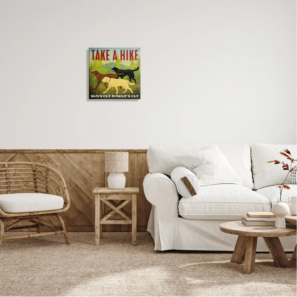 We create our stretched canvas to the highest standards. Using only the highest quality inks and canvas on Mimaki printers, we hand-cut and stretch each piece over a 1.5-inch thick wooden frame for hanging. As a result, the art comes ready to hang on the sturdy ledge with no installation required. Stupell Wall Art is made in the USA.Features: Dimensions: 17 x 1.5 x 17 InchesStretched Canvas Sizes Include Standard: 17 x 1.5 x 17 Large: 24 x 1.5 x 24 X-Large: 30 x 1.5 x 30 Oversized: 36 x 1.5 x 36Wall Art is Ready to Hang with Hardware Free Hanging. No installation required. For Easy Set Up Lean or Layer Artwork on Shelf or Against Wall.Our stretched canvas is created with the highest standards. We use only the highest quality inks and canvas on our in house Mimaki printers, and then hand cut and stretch each piece over a 1.5 inch thick wooden frame for hanging. Made In USA.Artwork Relates To: Animal, Canine, Dog, Mammal, Pet, Labrador Retriever, Trees, Landscape, Woodland, Take A Hike, Sun's Out Tongue's OutDesign by Ryan Fowler