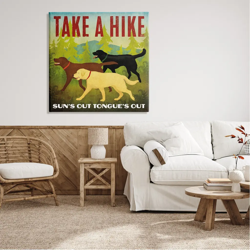 We create our stretched canvas to the highest standards. Using only the highest quality inks and canvas on Mimaki printers, we hand-cut and stretch each piece over a 1.5-inch thick wooden frame for hanging. As a result, the art comes ready to hang on the sturdy ledge with no installation required. Stupell Wall Art is made in the USA.Features: Dimensions: 17 x 1.5 x 17 InchesStretched Canvas Sizes Include Standard: 17 x 1.5 x 17 Large: 24 x 1.5 x 24 X-Large: 30 x 1.5 x 30 Oversized: 36 x 1.5 x 36Wall Art is Ready to Hang with Hardware Free Hanging. No installation required. For Easy Set Up Lean or Layer Artwork on Shelf or Against Wall.Our stretched canvas is created with the highest standards. We use only the highest quality inks and canvas on our in house Mimaki printers, and then hand cut and stretch each piece over a 1.5 inch thick wooden frame for hanging. Made In USA.Artwork Relates To: Animal, Canine, Dog, Mammal, Pet, Labrador Retriever, Trees, Landscape, Woodland, Take A Hike, Sun's Out Tongue's OutDesign by Ryan Fowler