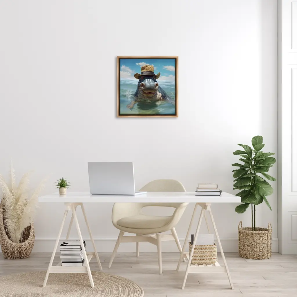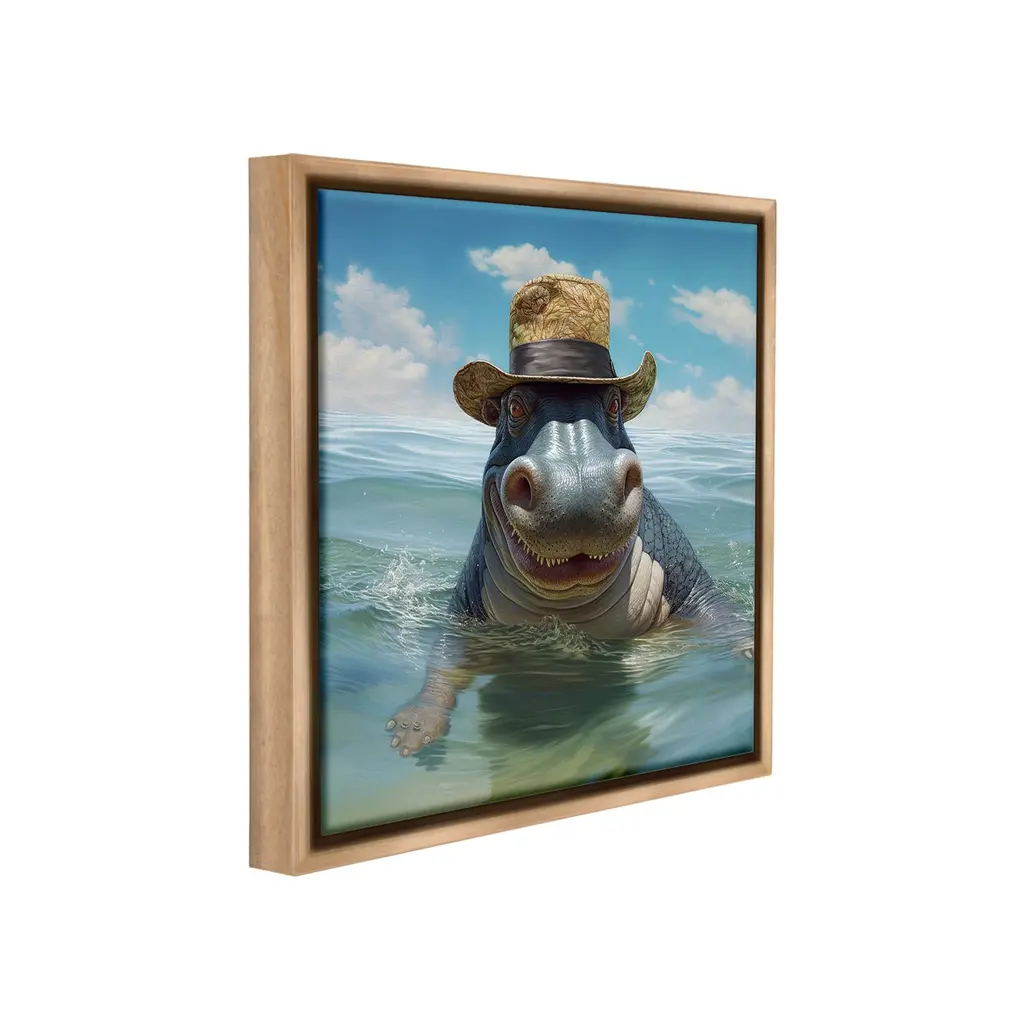 Elevate your home or office to the next level with Stupell Framed Floating Canvas Wall Art. Our premium hand-stretched canvas is mounted securely into a sturdy lightweight frame. The museum-style gap between the wrapped canvas and the box frame gives the illusion of floating artwork. Stupell Wall Art is made in the USA.Features: Dimensions: 18 x 1.7 x 18 Frame, 17 x 1.5 x 17 Canvas ArtFloating Frame Canvas Products are available in sizes 18"x18" and 25"x25". All Floating Frame Canvas Products have a 1.7" Depth.Wall Art is Ready to Hang with Hardware Free Hanging. No Installation required. For Easy Set Up Lean or Layer Artwork on Shelf or Against Wall. Artwork is Permently Fixed into the Frame.Our elevated 1.7" Thick Floating Frame is the perfect complement to our canvas style Wall Art. We use only the highest quality inks in house with industry leading printing solutions. Canvas is hand stretched over a durable wood foundation and then mounted securly into a Modern Box Frame. Made in the USA.Artwork Relates To: Animal, Mammal, Wildlife, Hippo, Hat, Ocean, Sea, FashionDesign by Lazar Studio