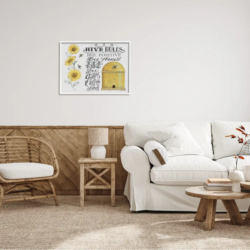 Stupell Hive Rules Motivational Phrases Bee Puns Vintage Beehive Framed Wall Art - Yellow - 30 X 24 - White