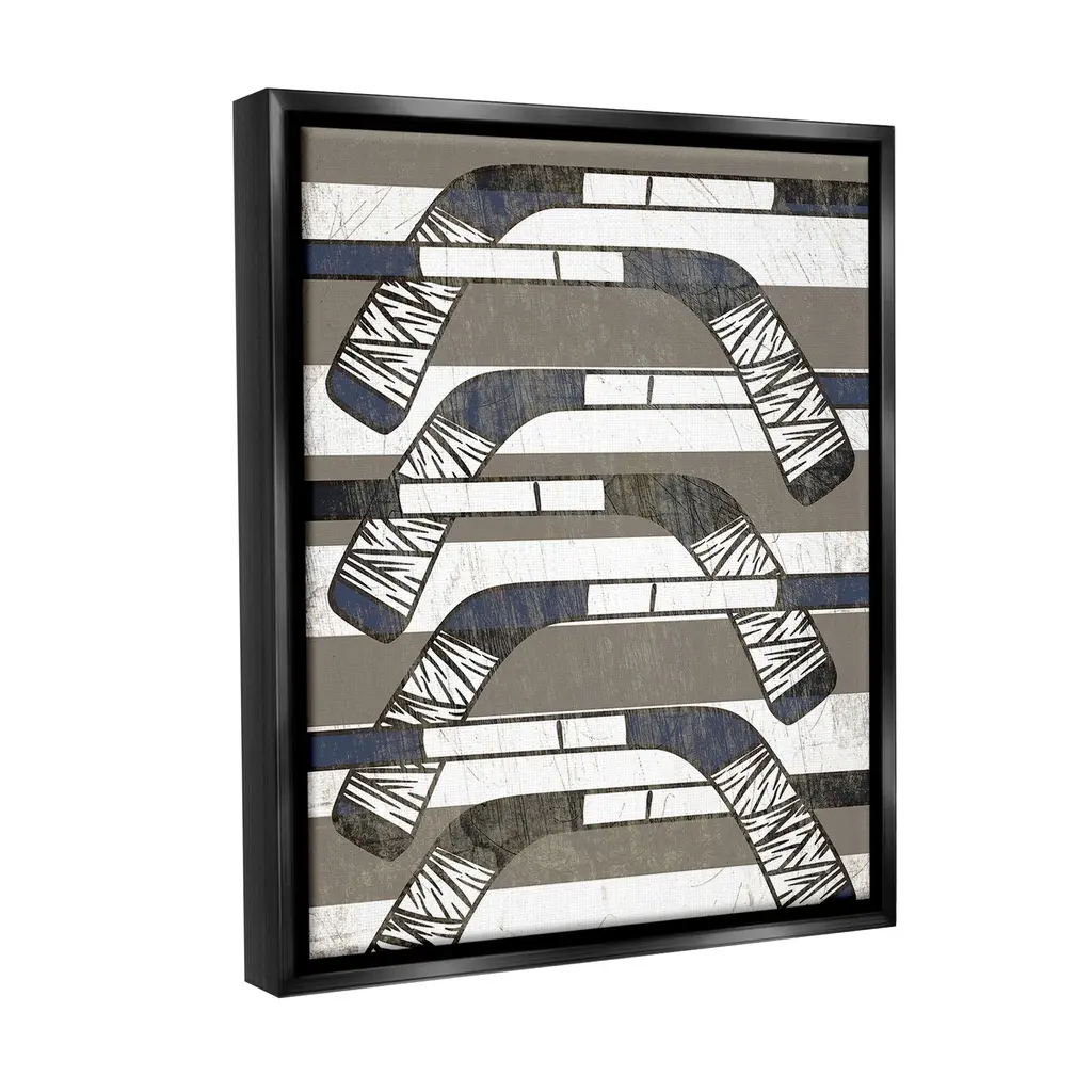 Elevate your home or office to the next level with Stupell Framed Floating Canvas Wall Art. Our premium hand-stretched canvas is mounted securely into a sturdy lightweight frame. The museum-style gap between the wrapped canvas and the box frame gives the illusion of floating artwork. Stupell Wall Art is made in the USA.Features: Dimensions: 17 x 1.7 x 21 Frame, 16 x 1.5 x 20 Canvas ArtFloating Frame Canvas Products are available in sizes 17"x21" and 25"x31". All Floating Frame Canvas Products have a 1.7" Depth.Wall Art is Ready to Hang with Hardware Free Hanging. No Installation required. For Easy Set Up Lean or Layer Artwork on Shelf or Against Wall. Artwork is Permently Fixed into the Frame.Our elevated 1.7" Thick Floating Frame is the perfect complement to our canvas style Wall Art. We use only the highest quality inks in house with industry leading printing solutions. Canvas is hand stretched over a durable wood foundation and then mounted securly into a Modern Box Frame. Made in the USA.Artwork Relates To: Sport, Hockey, Hockey Stick, Equipment, Shape, Pattern, AbstractDesign by Lil' Rue