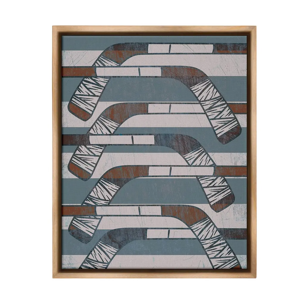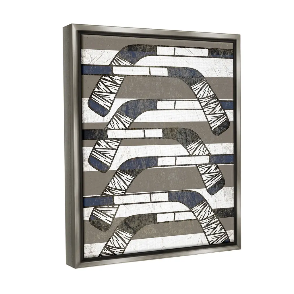 Elevate your home or office to the next level with Stupell Framed Floating Canvas Wall Art. Our premium hand-stretched canvas is mounted securely into a sturdy lightweight frame. The museum-style gap between the wrapped canvas and the box frame gives the illusion of floating artwork. Stupell Wall Art is made in the USA.Features: Dimensions: 17 x 1.7 x 21 Frame, 16 x 1.5 x 20 Canvas ArtFloating Frame Canvas Products are available in sizes 17"x21" and 25"x31". All Floating Frame Canvas Products have a 1.7" Depth.Wall Art is Ready to Hang with Hardware Free Hanging. No Installation required. For Easy Set Up Lean or Layer Artwork on Shelf or Against Wall. Artwork is Permently Fixed into the Frame.Our elevated 1.7" Thick Floating Frame is the perfect complement to our canvas style Wall Art. We use only the highest quality inks in house with industry leading printing solutions. Canvas is hand stretched over a durable wood foundation and then mounted securly into a Modern Box Frame. Made in the USA.Artwork Relates To: Sport, Hockey, Hockey Stick, Equipment, Shape, Pattern, AbstractDesign by Lil' Rue