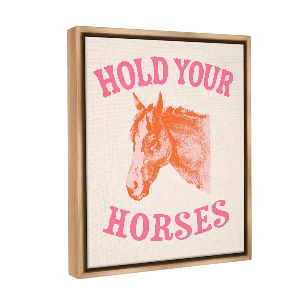 Elevate your home or office to the next level with Stupell Framed Floating Canvas Wall Art. Our premium hand-stretched canvas is mounted securely into a sturdy lightweight frame. The museum-style gap between the wrapped canvas and the box frame gives the illusion of floating artwork. Stupell Wall Art is made in the USA.Features: Dimensions: 17 x 1.7 x 21 Frame, 16 x 1.5 x 20 Canvas ArtFloating Frame Canvas Products are available in sizes 17"x21" and 25"x31". All Floating Frame Canvas Products have a 1.7" Depth.Wall Art is Ready to Hang with Hardware Free Hanging. No Installation required. For Easy Set Up Lean or Layer Artwork on Shelf or Against Wall. Artwork is Permently Fixed into the Frame.Our elevated 1.7" Thick Floating Frame is the perfect complement to our canvas style Wall Art. We use only the highest quality inks in house with industry leading printing solutions. Canvas is hand stretched over a durable wood foundation and then mounted securly into a Modern Box Frame. Made in the USA.Artwork Relates To: Animal, Horse, Mammal, Saddle, Equestrian, Rodeo, Country, Southwestern, Cowboy, Cowgirl, Phrase, Humor, Hold Your HorsesDesign by Victoria Barnes