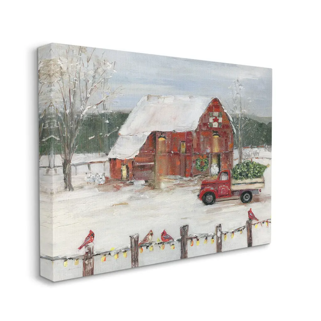 We create our stretched canvas to the highest standards. Using only the highest quality inks and canvas on Mimaki printers, we hand-cut and stretch each piece over a 1.5-inch thick wooden frame for hanging. As a result, the art comes ready to hang on the sturdy ledge with no installation required. Stupell Wall Art is made in the USA.Features: Dimensions: 20 x 1.5 x 16 InchesStretched Canvas Sizes Include Standard: 20 x 1.5 x 16 Large: 30 x 1.5 x 20 X-Large: 40 x 1.5 x 30 Oversized: 48 x 1.5 x 36Wall Art is Ready to Hang - No Installation or Hardware Needed. For Easy Set Up Lean or Layer Artwork on Shelf or Against Wall.Our stretched canvas is created with the highest standards. We use only the highest quality inks and canvas on our in house Mimaki printers, and then hand cut and stretch each piece over a 1.5 inch thick wooden frame for hanging. Made In USA.Artwork Relates To: Nature, Countryside, Barn, Farm, Rural, Painting, Truck, Vehicle, Seasonal, Winter, Snow, Cardinal, Bird, Christmas TreeDesign by Sally Swatland
