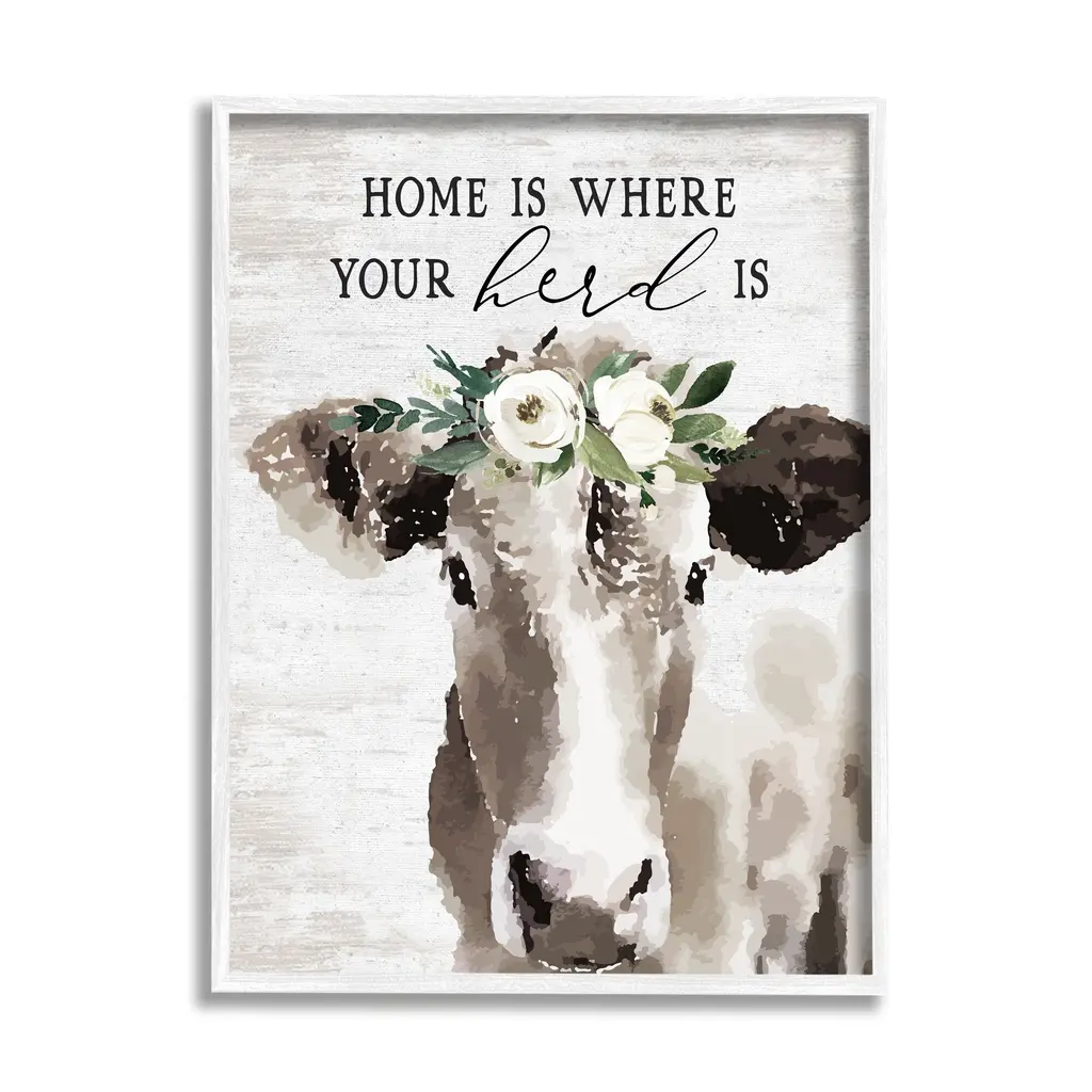 Stupell Home's Where Your Herd Is Boho Floral Cow Framed Wall Art - 11 X 14 - White