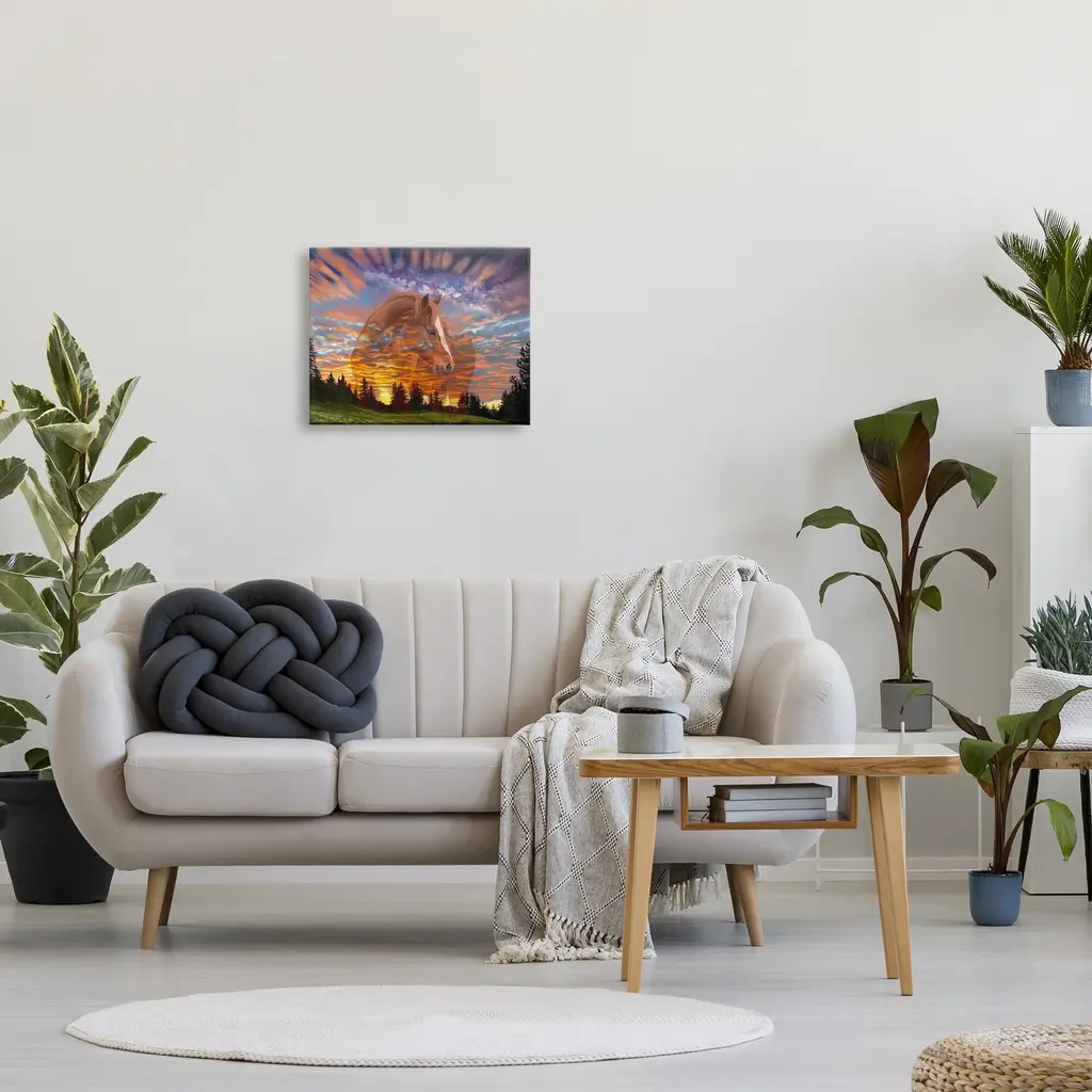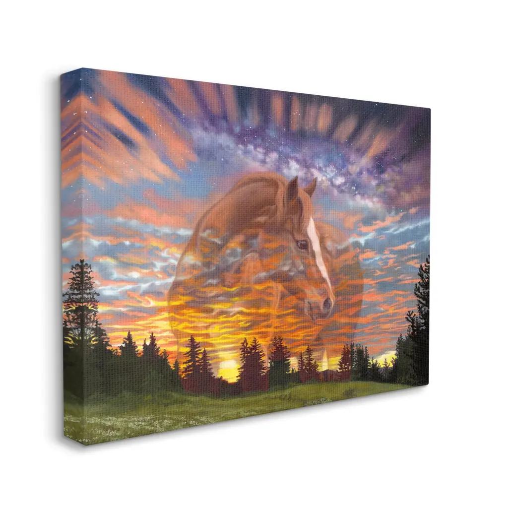 We create our stretched canvas to the highest standards. Using only the highest quality inks and canvas on Mimaki printers, we hand-cut and stretch each piece over a 1.5-inch thick wooden frame for hanging. As a result, the art comes ready to hang on the sturdy ledge with no installation required. Stupell Wall Art is made in the USA.Features: Dimensions: 20 x 1.5 x 16 InchesStretched Canvas Sizes Include Standard: 20 x 1.5 x 16 Large: 30 x 1.5 x 20 X-Large: 40 x 1.5 x 30 Oversized: 48 x 1.5 x 36Wall Art is Ready to Hang - No Installation or Hardware Needed. For Easy Set Up Lean or Layer Artwork on Shelf or Against Wall.Our stretched canvas is created with the highest standards. We use only the highest quality inks and canvas on our in house Mimaki printers, and then hand cut and stretch each piece over a 1.5 inch thick wooden frame for hanging. Made In USA.Artwork Relates To: Tree, Painting, Animal, Horse, Mammal, Nature, Colt Horse, Sunlight, Sky, Stallion, LandscapeDesign by Kim McElroy