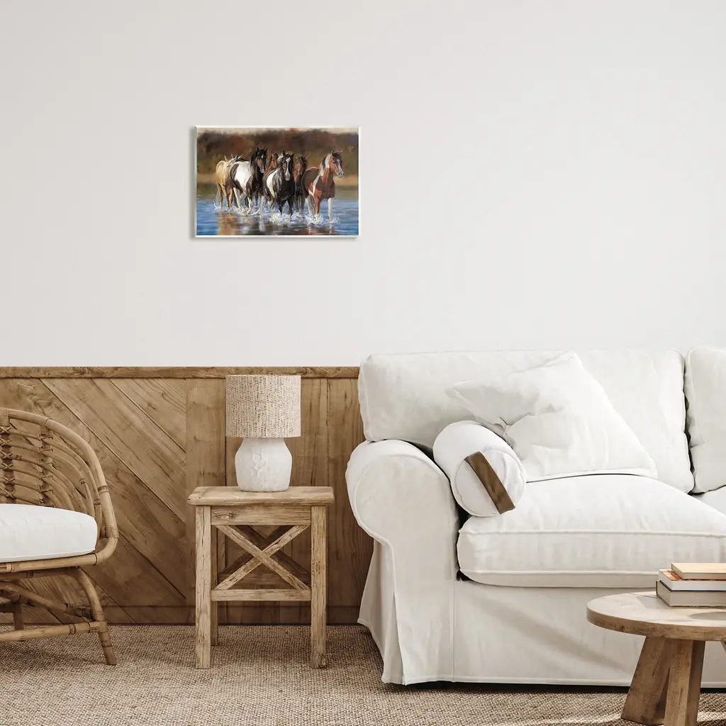 Our wall plaques start as high-quality lithograph prints mounted on durable 0.5-inch thick MDF wood. Each piece is hand finished and comes with a fresh layer of white foil on the sides to give it a crisp, clean look. Plaques arrive ready to hang without installation and come with removable plastic corners to keep them from damage in transit. Wall Art is made in the USA.Features: Dimensions: 15 x 0.5 x 10 InchesWall Plaque Sizes Include Standard: 15 x 0.5 x 10 Oversized: 19 x 0.5 x 13Wall Art is Ready to Hang with Hardware Free Hanging. No installation required. For Easy Set Up Lean or Layer Artwork on Shelf or Against Wall.All of our wall plaques start off as high quality lithograph prints that are then mounted on durable 0.5 inch thick MDF wood. Each piece is hand finished and comes with a fresh layer of foil on the sides to give it a crisp clean look. Made In USA.Artwork Relates To: Animal, Herd, Horse, Mammal, Colt Horse, Stallion, WaterDesign by Victoria Schultz
