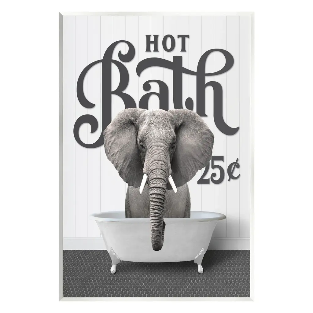 Our wall plaques start as high-quality lithograph prints mounted on durable 0.5-inch thick MDF wood. Each piece is hand finished and comes with a fresh layer of white foil on the sides to give it a crisp, clean look. Plaques arrive ready to hang without installation and come with removable plastic corners to keep them from damage in transit. Stupell Wall Art is made in the USA.Features: Dimensions: 10 x 0.5 x 15 InchesWall Plaque Sizes Include Standard: 10 x 0.5 x 15 Oversized: 13 x 0.5 x 19Wall Art is Ready to Hang with Hardware Free Hanging. No installation required. For Easy Set Up Lean or Layer Artwork on Shelf or Against Wall.All of our wall plaques start off as high quality lithograph prints that are then mounted on durable 0.5 inch thick MDF wood. Each piece is hand finished and comes with a fresh layer of foil on the sides to give it a crisp clean look. Made In USA.Artwork Relates To: Animal, Bathing, Bathroom, Hot Bath, Phrase, ElephantDesign by Lettered and Lined
