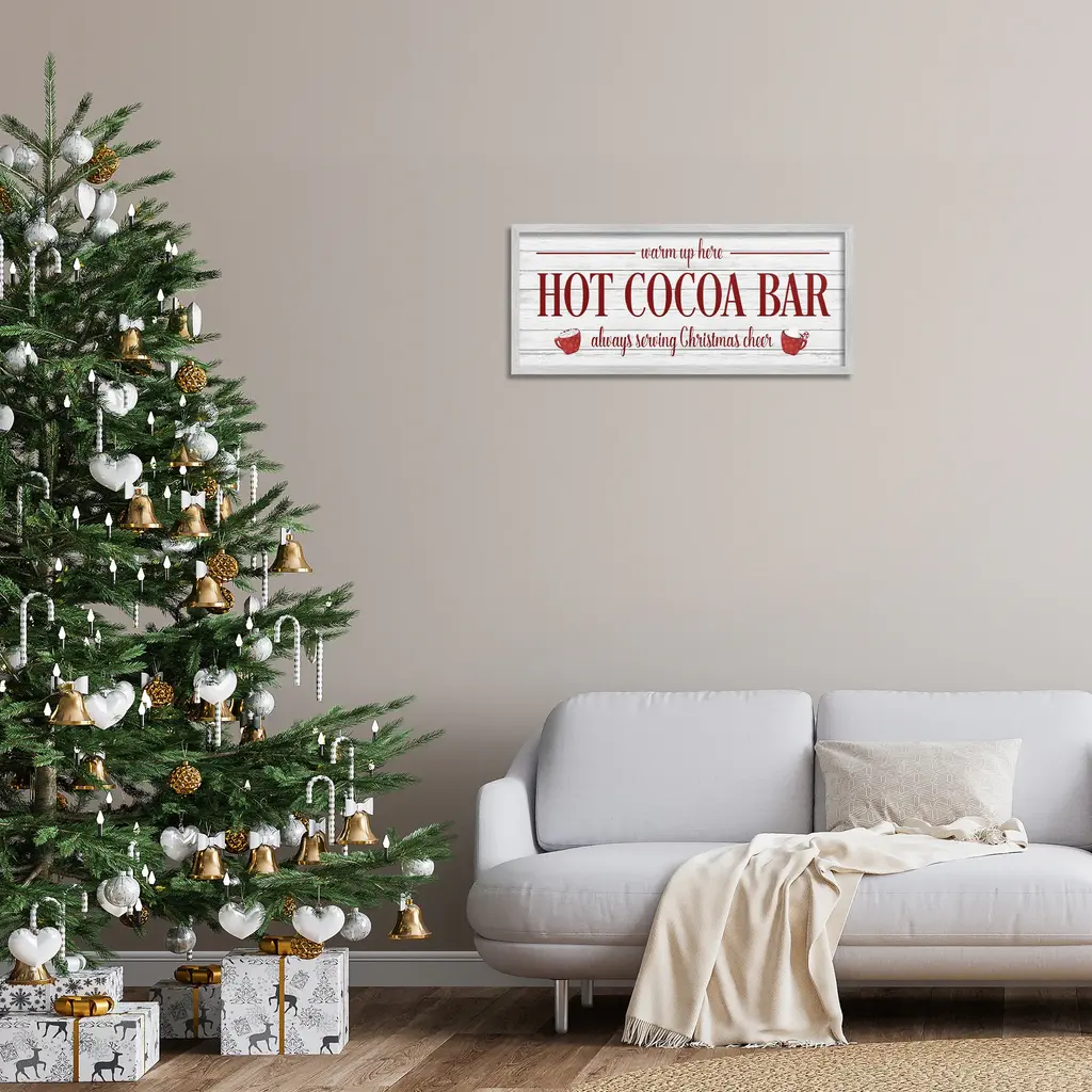 Add dimension to any room with our textured Framed Giclee Artwork. Our framed artwork is securely mounted into a 1.5-inch thick wood grain frame and ready to hang. Frames are available in three alluring styles: black, gray farmhouse and white. In addition, you should check out our oversized options if you want a statement piece. Stupell Wall Art is made in the USA.Features: Dimensions: 24 x 1.5 x 10 FramedFramed Giclee Sizes Include Standard: 24 x 1.5 x 10 Oversized: 30 x 1.5 x 13Wall Art is Ready to Hang - No Installation or Hardware Needed. For Easy Set Up Lean or Layer Artwork on Shelf or Against Wall.Our giclée prints are carefully mounted on a durable MDF backing, and then perfectly finished in a 1.5 inch thick woodgrain frame. Mounted frame colors include black, gray farmhouse and white. Made In USA.Artwork Relates To: Sign, Phrase, Christmas, Winter, Holiday, Warm Up Here Hot Cocoa Bar Always Serving Christmas CheerDesign by Natalie Carpentieri