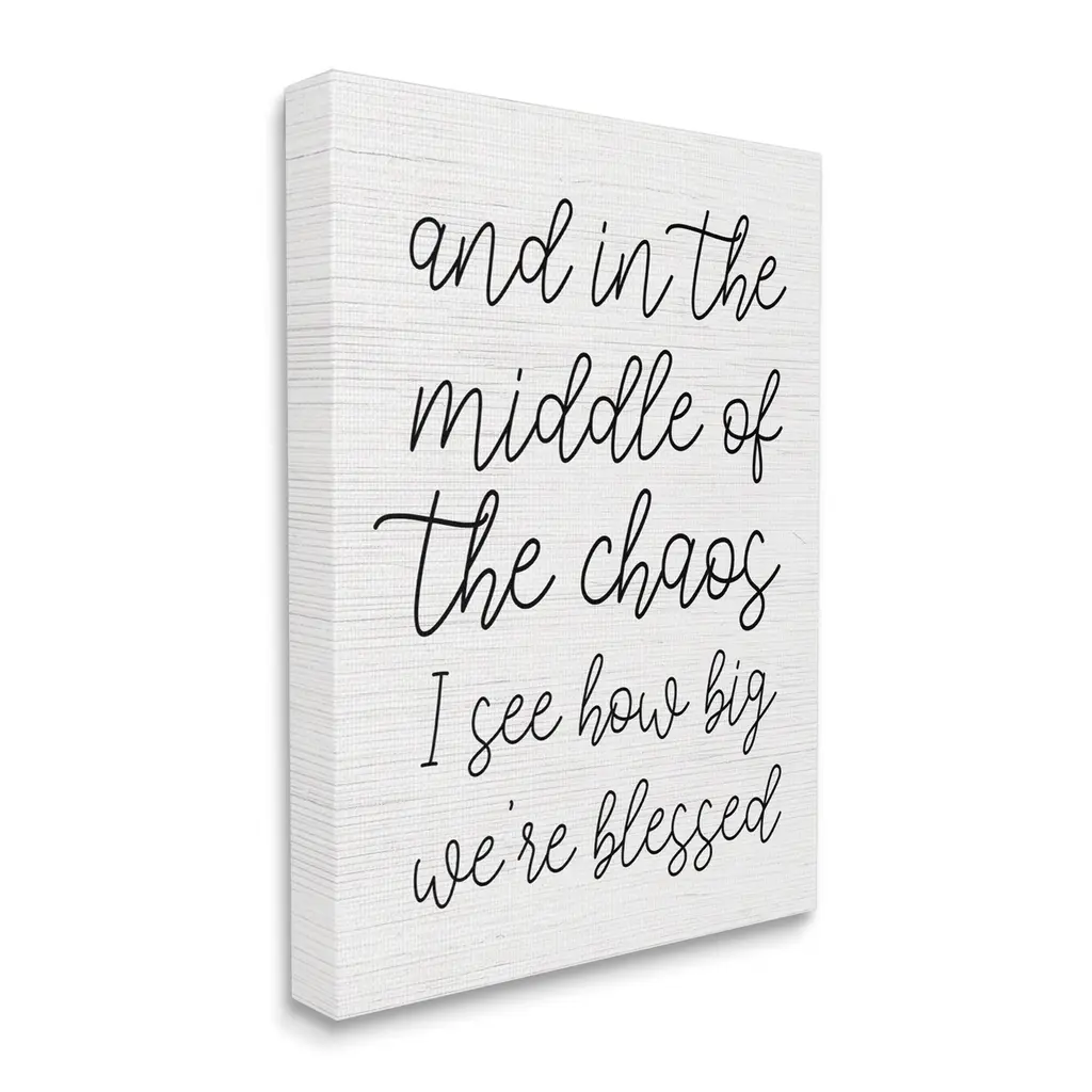 We create our stretched canvas to the highest standards. Using only the highest quality inks and canvas on Mimaki printers, we hand-cut and stretch each piece over a 1.5-inch thick wooden frame for hanging. As a result, the art comes ready to hang on the sturdy ledge with no installation required. Stupell Wall Art is made in the USA.Features: Dimensions: 16 x 1.5 x 20 InchesStretched Canvas Sizes Include Standard: 16 x 1.5 x 20 Large: 20 x 1.5 x 30 X-Large: 30 x 1.5 x 40 Oversized: 36 x 1.5 x 48Wall Art is Ready to Hang - No Installation or Hardware Needed. For Easy Set Up Lean or Layer Artwork on Shelf or Against Wall.Our stretched canvas is created with the highest standards. We use only the highest quality inks and canvas on our in house Mimaki printers, and then hand cut and stretch each piece over a 1.5 inch thick wooden frame for hanging. Made In USA.Artwork Relates To: Family, Love, Phrase, Blessed, And in the Middle of the Chaos I See How Big We're BlessedDesign by Lil' Rue