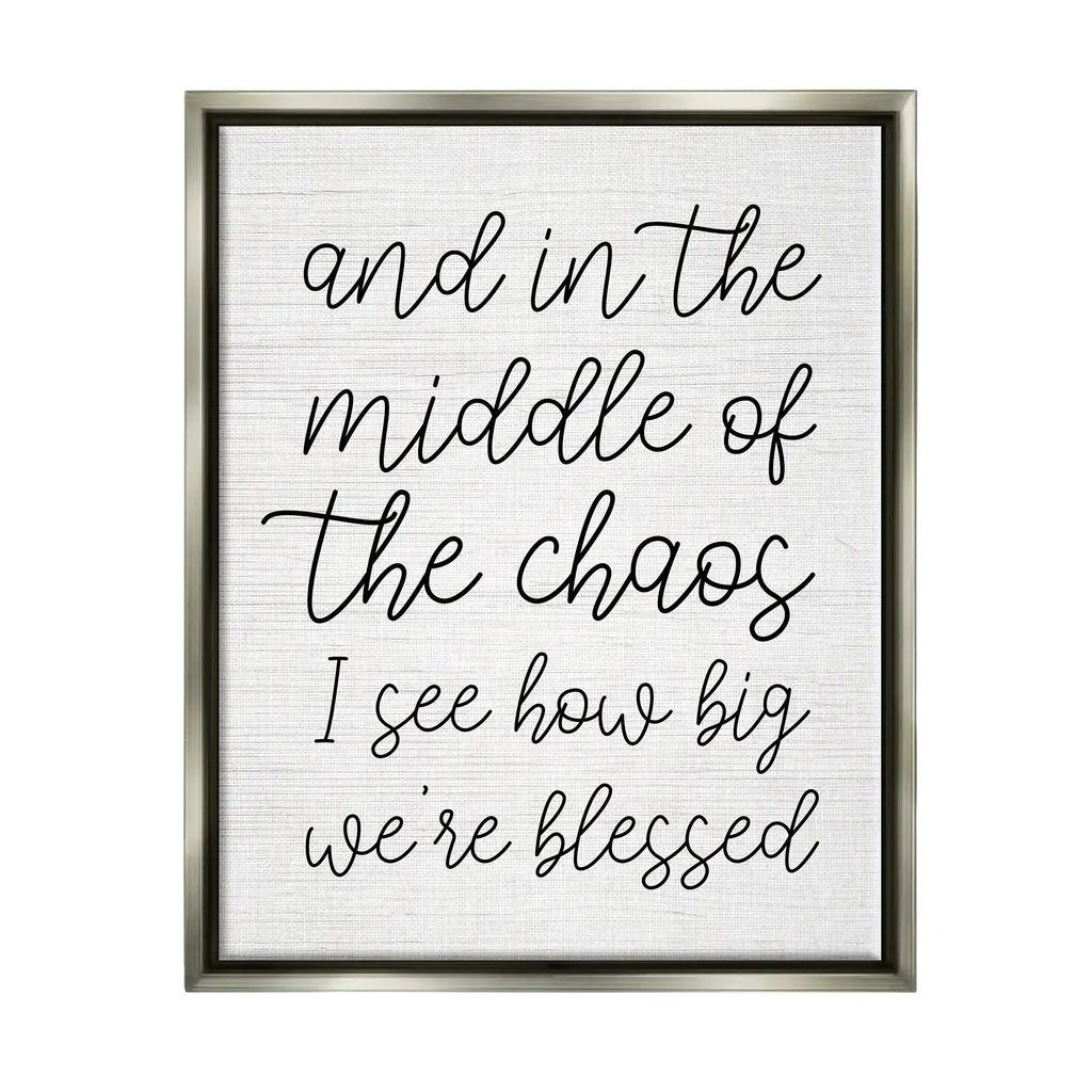 Elevate your home or office to the next level with Stupell Framed Floating Canvas Wall Art. Our premium hand-stretched canvas is mounted securely into a sturdy lightweight frame. The museum-style gap between the wrapped canvas and the box frame gives the illusion of floating artwork. Stupell Wall Art is made in the USA.Features: Dimensions: 17 x 1.7 x 21 Frame, 16 x 1.5 x 20 Canvas ArtFloating Frame Sizes Include Standard: 17 x 1.7 x 21 Oversized: 25 x 1.7 x 31Wall Art is Ready to Hang - No Installation or Hardware Needed. For Easy Set Up Lean or Layer Artwork on Shelf or Against Wall.Our elevated 1.7" Thick Floating Frame is the perfect complement to our canvas style Wall Art. We use only the highest quality inks in house with industry leading printing solutions. Canvas is hand stretched over a durable wood foundation and then mounted securly into a Modern Box Frame. Made in the USA.Artwork Relates To: Family, Love, Phrase, Blessed, And in the Middle of the Chaos I See How Big We're BlessedDesign by Lil' Rue