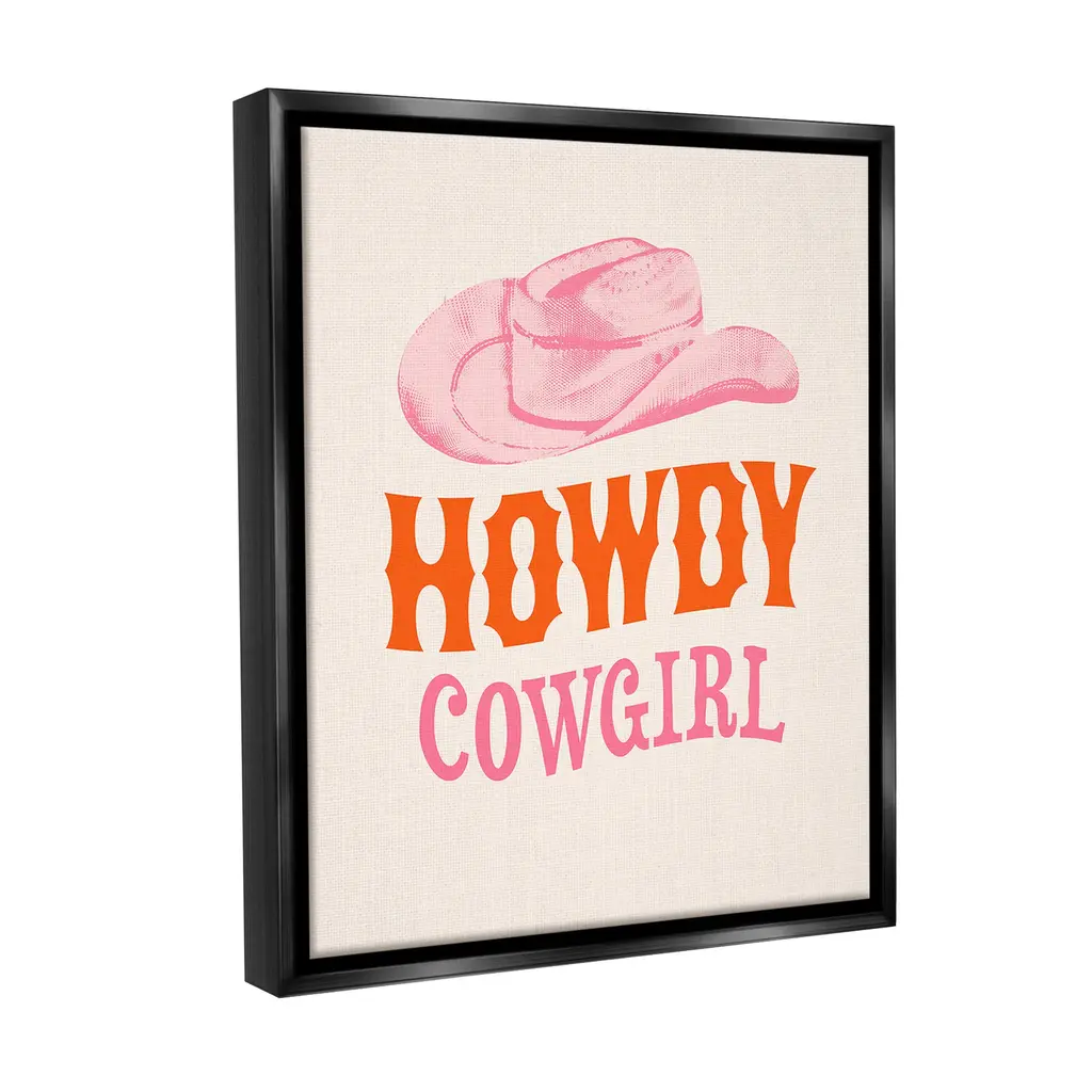 Elevate your home or office to the next level with Stupell Framed Floating Canvas Wall Art. Our premium hand-stretched canvas is mounted securely into a sturdy lightweight frame. The museum-style gap between the wrapped canvas and the box frame gives the illusion of floating artwork. Stupell Wall Art is made in the USA.Features: Dimensions: 17 x 1.7 x 21 Frame, 16 x 1.5 x 20 Canvas ArtFloating Frame Canvas Products are available in sizes 17"x21" and 25"x31". All Floating Frame Canvas Products have a 1.7" Depth.Wall Art is Ready to Hang with Hardware Free Hanging. No Installation required. For Easy Set Up Lean or Layer Artwork on Shelf or Against Wall. Artwork is Permently Fixed into the Frame.Our elevated 1.7" Thick Floating Frame is the perfect complement to our canvas style Wall Art. We use only the highest quality inks in house with industry leading printing solutions. Canvas is hand stretched over a durable wood foundation and then mounted securly into a Modern Box Frame. Made in the USA.Artwork Relates To: Animal, Horse, Mammal, Saddle, Equestrian, Rodeo, Country, Southwestern, Cowboy, Cowgirl, Phrase, Humor, Howdy CowgirlDesign by Victoria Barnes