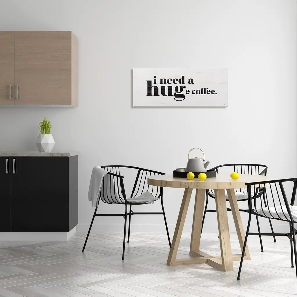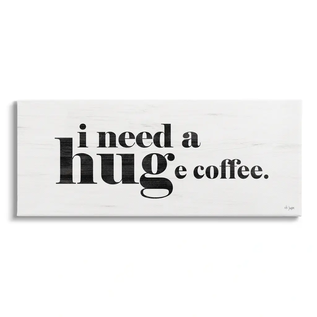 We create our stretched canvas to the highest standards. Using only the highest quality inks and canvas on Mimaki printers, we hand-cut and stretch each piece over a 1.5-inch thick wooden frame for hanging. As a result, the art comes ready to hang on the sturdy ledge with no installation required. Stupell Wall Art is made in the USA.Features: Dimensions: 24 x 1.5 x 10 InchesStretched Canvas Sizes Include Standard: 24 x 1.5 x 10 Large: 30 x 1.5 x 13 X-Large: 40 x 1.5 x 17 Oversized: 48 x 1.5 x 20Wall Art is Ready to Hang with Hardware Free Hanging. No installation required. For Easy Set Up Lean or Layer Artwork on Shelf or Against Wall.Our stretched canvas is created with the highest standards. We use only the highest quality inks and canvas on our in house Mimaki printers, and then hand cut and stretch each piece over a 1.5 inch thick wooden frame for hanging. Made In USA.Artwork Relates To: Coffee, Kitchen, Phrase, Humor, I Need a Huge CoffeeDesign by Jaxn Blvd.