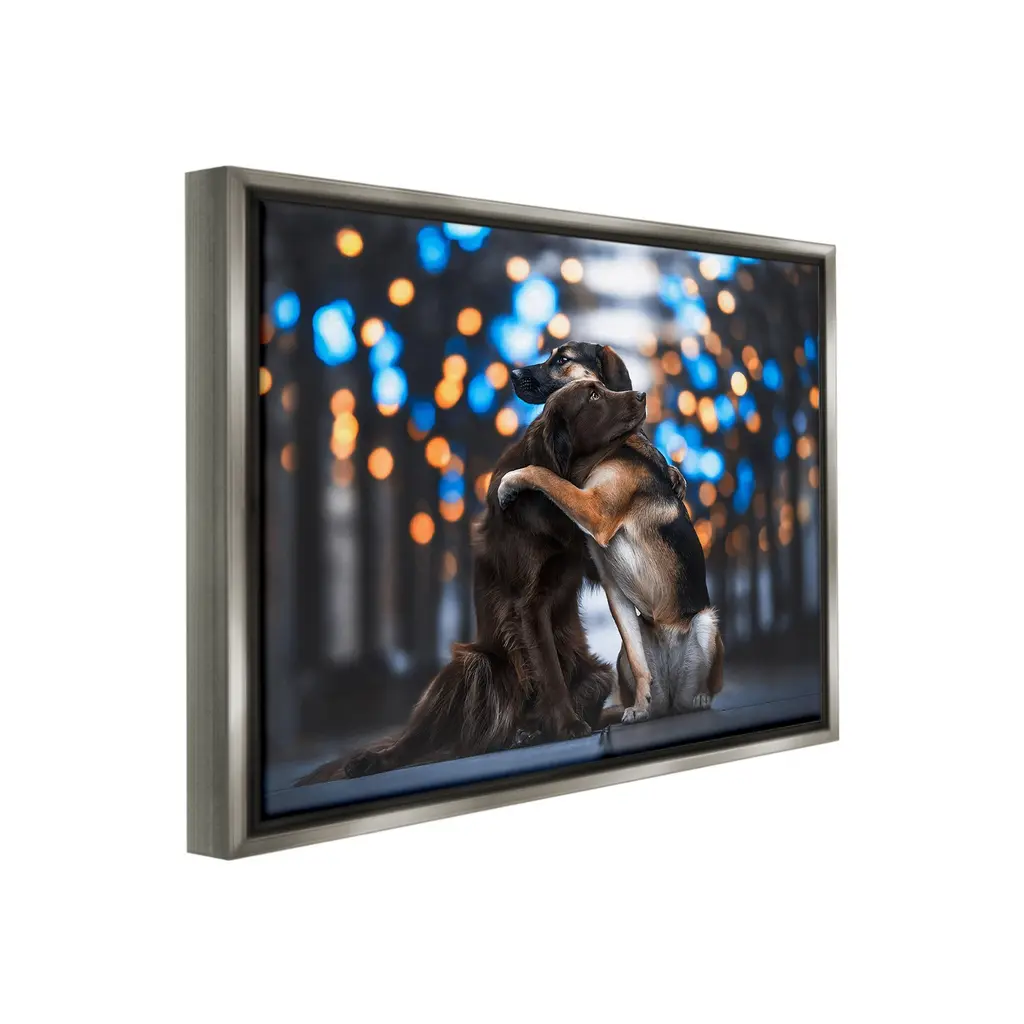 Elevate your home or office to the next level with Stupell Framed Floating Canvas Wall Art. Our premium hand-stretched canvas is mounted securely into a sturdy lightweight frame. The museum-style gap between the wrapped canvas and the box frame gives the illusion of floating artwork. Stupell Wall Art is made in the USA.Features: Dimensions: 21 x 1.7 x 17 Frame, 20 x 1.5 x 16 Canvas ArtFloating Frame Canvas Products are available in sizes 21"x17" and 31"x25". All Floating Frame Canvas Products have a 1.7" Depth.Wall Art is Ready to Hang with Hardware Free Hanging. No Installation required. For Easy Set Up Lean or Layer Artwork on Shelf or Against Wall. Artwork is Permently Fixed into the Frame.Our elevated 1.7" Thick Floating Frame is the perfect complement to our canvas style Wall Art. We use only the highest quality inks in house with industry leading printing solutions. Canvas is hand stretched over a durable wood foundation and then mounted securly into a Modern Box Frame. Made in the USA.Artwork Relates To: Animal, Canine, Mammal, Pet, Dog, Puppy, Hug, BokehDesign by Natalie Grosse
