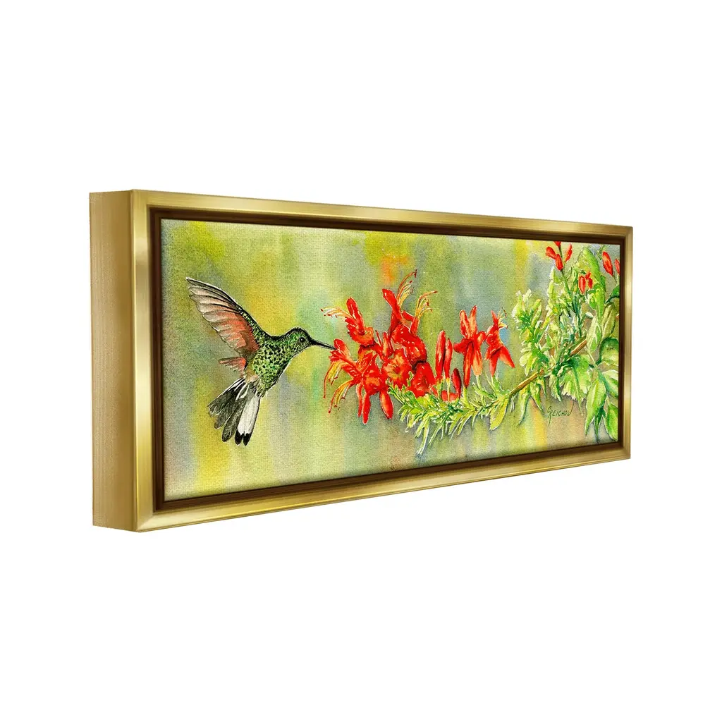 Elevate your home or office to the next level with Stupell Framed Floating Canvas Wall Art. Our premium hand-stretched canvas is mounted securely into a sturdy lightweight frame. The museum-style gap between the wrapped canvas and the box frame gives the illusion of floating artwork. Stupell Wall Art is made in the USA.Features: Dimensions: 25 x 1.7 x 11 Frame, 24 x 1.5 x 10 Canvas ArtFloating Frame Canvas Products are available in sizes 25"x11" and 31"x14". All Floating Frame Canvas Products have a 1.7" Depth.Wall Art is Ready to Hang with Hardware Free Hanging. No Installation required. For Easy Set Up Lean or Layer Artwork on Shelf or Against Wall. Artwork is Permently Fixed into the Frame.Our elevated 1.7" Thick Floating Frame is the perfect complement to our canvas style Wall Art. We use only the highest quality inks in house with industry leading printing solutions. Canvas is hand stretched over a durable wood foundation and then mounted securly into a Modern Box Frame. Made in the USA.Artwork Relates To: Animal, Bird, Hummingbird, Flying, Beak, Flower, Plant, Flower, Hibiscus, LilyDesign by Christine Reichow