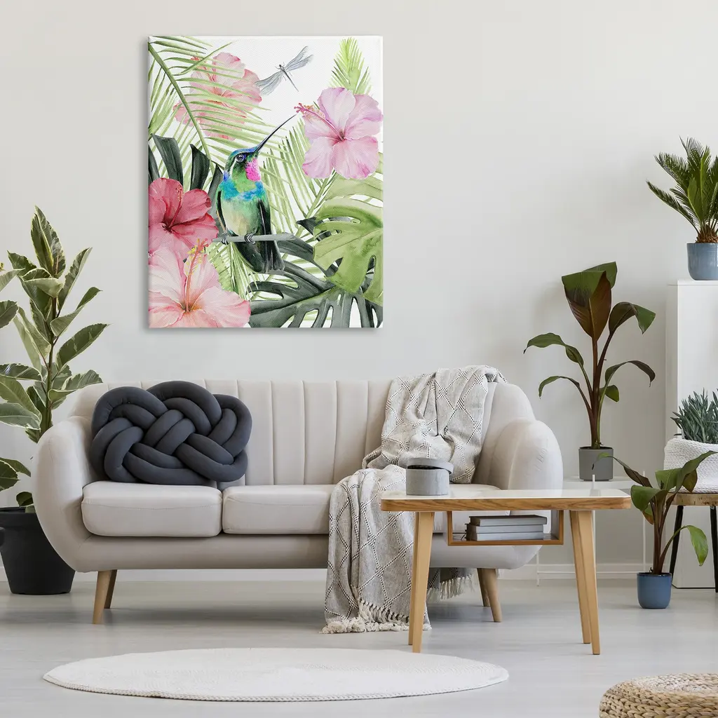We create our stretched canvas to the highest standards. Using only the highest quality inks and canvas on Mimaki printers, we hand-cut and stretch each piece over a 1.5-inch thick wooden frame for hanging. As a result, the art comes ready to hang on the sturdy ledge with no installation required. Stupell Wall Art is made in the USA.Features: Dimensions: 16 x 1.5 x 20 InchesStretched Canvas Sizes Include Standard: 16 x 1.5 x 20 Large: 20 x 1.5 x 30 X-Large: 30 x 1.5 x 40 Oversized: 36 x 1.5 x 48Wall Art is Ready to Hang - No Installation or Hardware Needed. For Easy Set Up Lean or Layer Artwork on Shelf or Against Wall.Our stretched canvas is created with the highest standards. We use only the highest quality inks and canvas on our in house Mimaki printers, and then hand cut and stretch each piece over a 1.5 inch thick wooden frame for hanging. Made In USA.Artwork Relates To: Animal, Bird, Flower, Petal, Plant, Hummingbird, Hibiscus, Palms, MonsteraDesign by Jennifer Paxton Parker