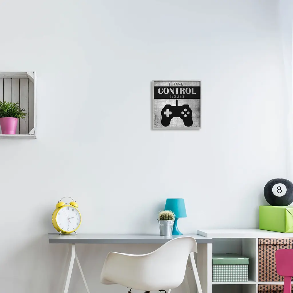 Our Framed Giclee Wall Art adds a touch of class to any space in your home or office. Frames are available in three alluring styles: black, gray farmhouse and white. Our textured artwork will add more depth and dimension to any space. Each piece is mounted with a 1.5 inch thick wood grain frame that is ready to hang! Looking for a statement piece? We have oversized artwork available.Features: Dimensions: 12 x 1.5 x 12 FramedFramed Giclee Sizes Include Standard: 12 x 1.5 x 12 Large: 17 x 1.5 x 17 Oversized: 24 x 1.5 x 24Wall Art is Ready to Hang - No Installation or Hardware Needed. For Easy Set Up Lean or Layer Artwork on Shelf or Against Wall.Our giclée prints are carefully mounted on a durable MDF backing, and then perfectly finished in a 1.5 inch thick woodgrain frame. Mounted frame colors include black, gray farmhouse and white. Made In USA.Artwork Relates To: Electronics, Joystick, Game Controller, Gaming, Video Game, GamerDesign by Denise BrownKid's Room, Nursery, Playroom, Classroom or Kid's Bedroom.Text Includes: I Have Control Issues