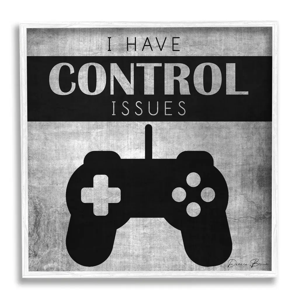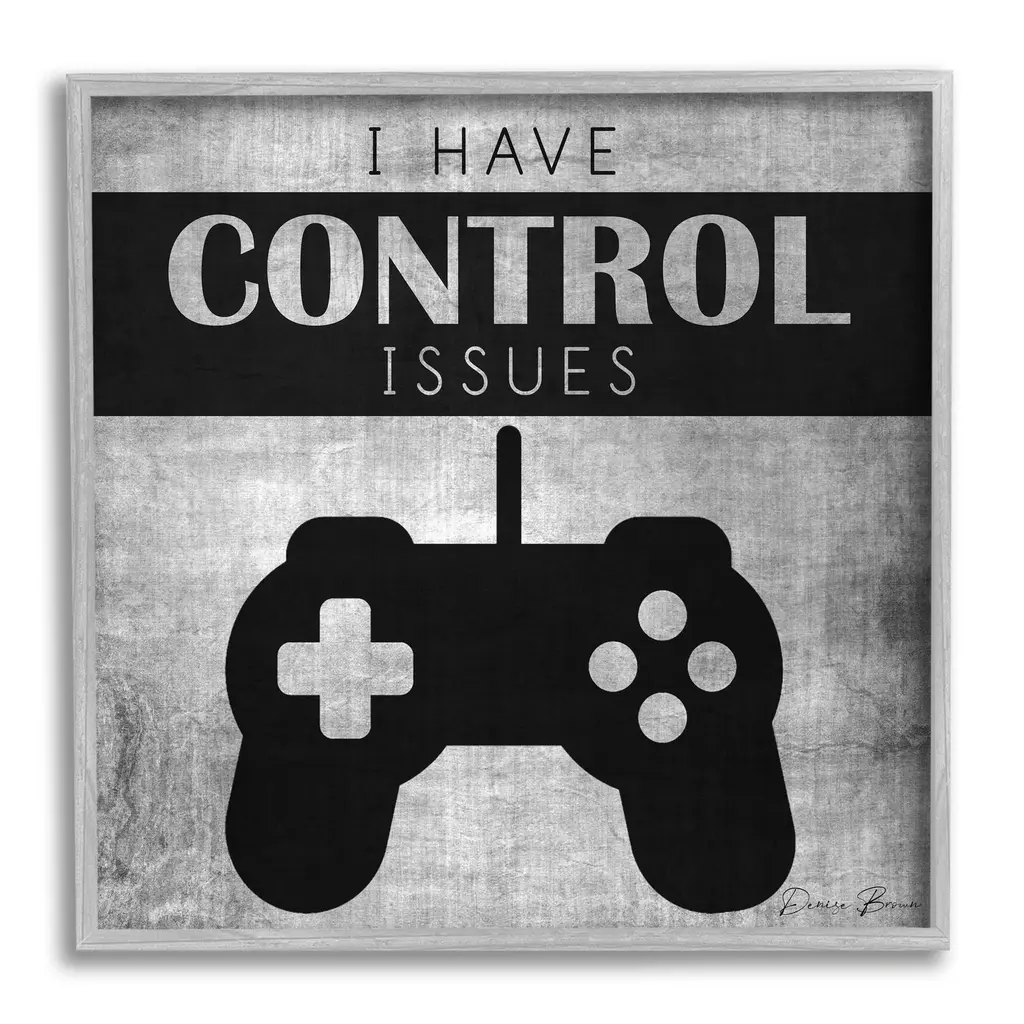Our Framed Giclee Wall Art adds a touch of class to any space in your home or office. Frames are available in three alluring styles: black, gray farmhouse and white. Our textured artwork will add more depth and dimension to any space. Each piece is mounted with a 1.5 inch thick wood grain frame that is ready to hang! Looking for a statement piece? We have oversized artwork available.Features: Dimensions: 12 x 1.5 x 12 FramedFramed Giclee Sizes Include Standard: 12 x 1.5 x 12 Large: 17 x 1.5 x 17 Oversized: 24 x 1.5 x 24Wall Art is Ready to Hang - No Installation or Hardware Needed. For Easy Set Up Lean or Layer Artwork on Shelf or Against Wall.Our giclée prints are carefully mounted on a durable MDF backing, and then perfectly finished in a 1.5 inch thick woodgrain frame. Mounted frame colors include black, gray farmhouse and white. Made In USA.Artwork Relates To: Electronics, Joystick, Game Controller, Gaming, Video Game, GamerDesign by Denise BrownKid's Room, Nursery, Playroom, Classroom or Kid's Bedroom.Text Includes: I Have Control Issues
