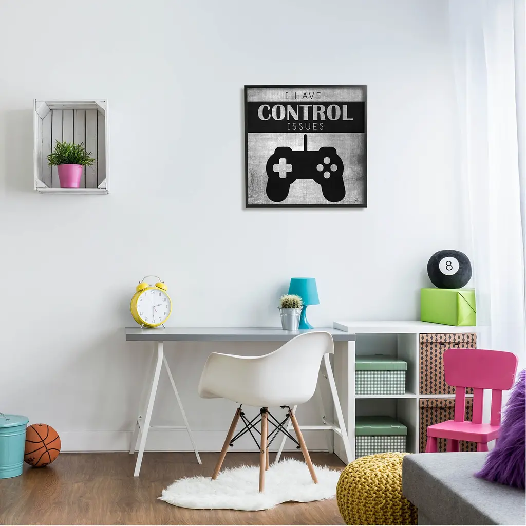 Our Framed Giclee Wall Art adds a touch of class to any space in your home or office. Frames are available in three alluring styles: black, gray farmhouse and white. Our textured artwork will add more depth and dimension to any space. Each piece is mounted with a 1.5 inch thick wood grain frame that is ready to hang! Looking for a statement piece? We have oversized artwork available.Features: Dimensions: 12 x 1.5 x 12 FramedFramed Giclee Sizes Include Standard: 12 x 1.5 x 12 Large: 17 x 1.5 x 17 Oversized: 24 x 1.5 x 24Wall Art is Ready to Hang - No Installation or Hardware Needed. For Easy Set Up Lean or Layer Artwork on Shelf or Against Wall.Our giclée prints are carefully mounted on a durable MDF backing, and then perfectly finished in a 1.5 inch thick woodgrain frame. Mounted frame colors include black, gray farmhouse and white. Made In USA.Artwork Relates To: Electronics, Joystick, Game Controller, Gaming, Video Game, GamerDesign by Denise BrownKid's Room, Nursery, Playroom, Classroom or Kid's Bedroom.Text Includes: I Have Control Issues
