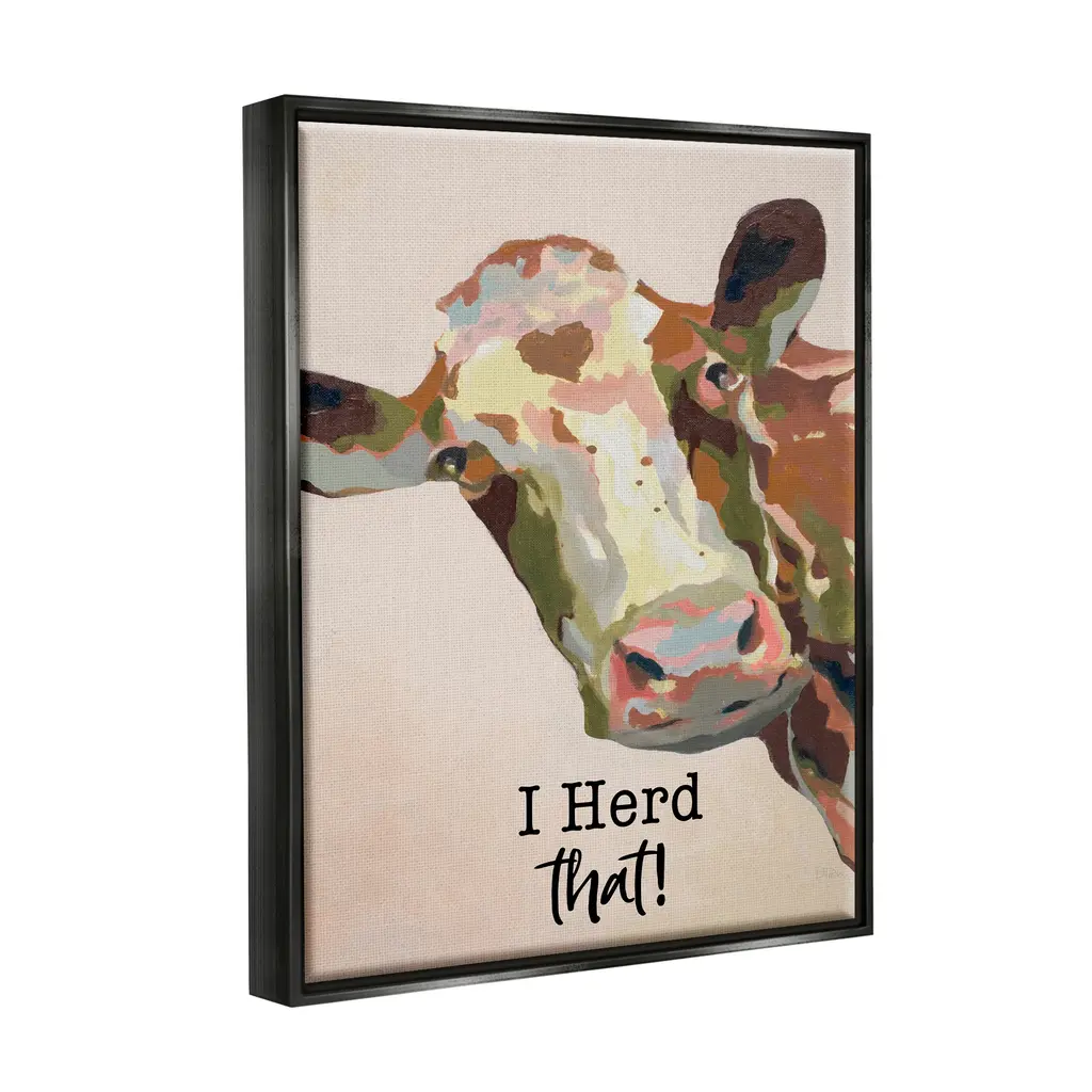 Elevate your home or office to the next level with Stupell Framed Floating Canvas Wall Art. Our premium hand stretched canvas is mounted securly into a sturdy lightweight frame. The museum style gap between wrapped canvas and box frame gives the illusion of floating artwork. Room Type: Living Room, Den, Hallway, Office, Entryway, Study, Dining Room or Bedroom, Guest Room, Studio, Dorm or BoudoirFeatures: Dimensions: 17 x 1.7 x 21 Frame, 16 x 1.5 x 20 Canvas ArtFloating Frame Sizes Include Standard: 17 x 1.7 x 21 Oversized: 25 x 1.7 x 31Wall Art is Ready to Hang - No Installation or Hardware Needed. For Easy Set Up Lean or Layer Artwork on Shelf or Against Wall.Our elevated 1.7" Thick Floating Frame is the perfect complement to our canvas style Wall Art. We use only the highest quality inks in house with industry leading printing solutions. Canvas is hand stretched over a durable wood foundation and then mounted securly into a Modern Box Frame. Made in the USA.Artwork Relates To: Animal, Cattle, Mammal, Cow, Farm, I Herd that!Design by Patricia Pinto