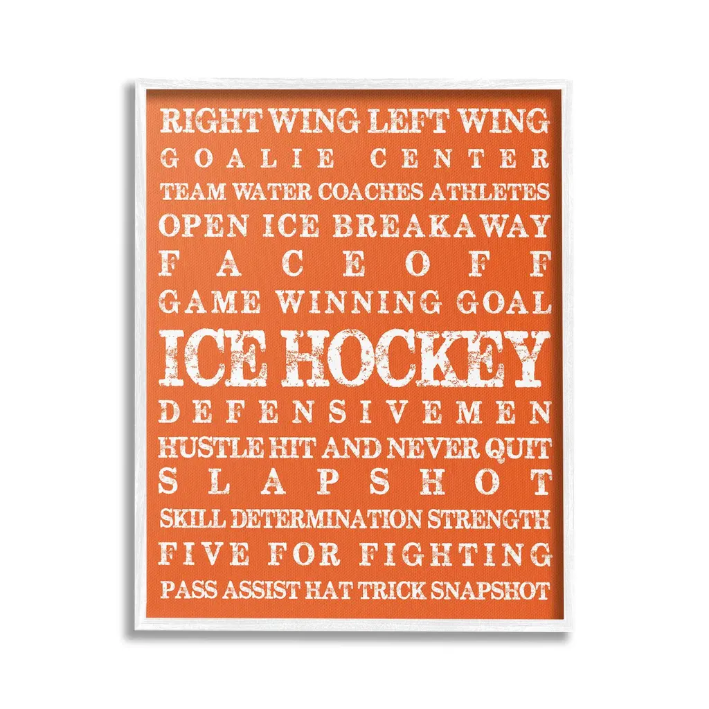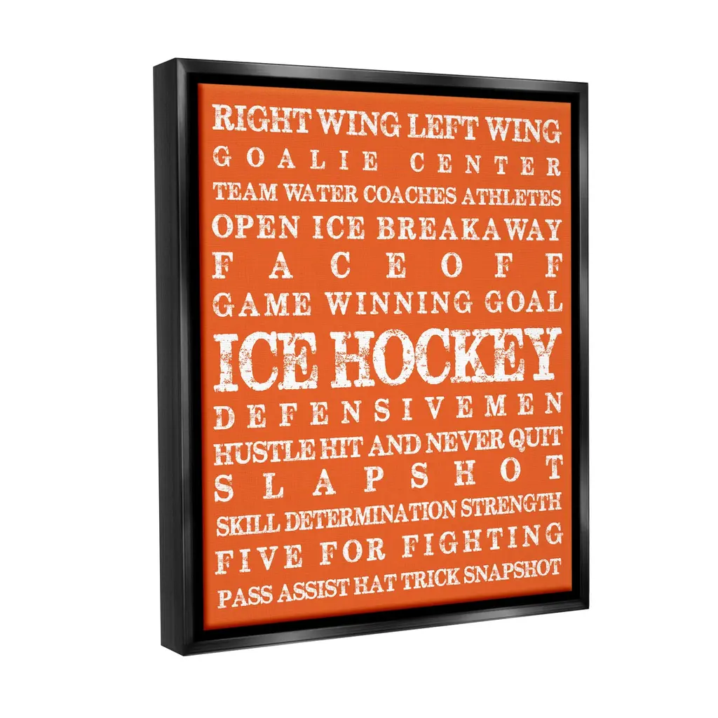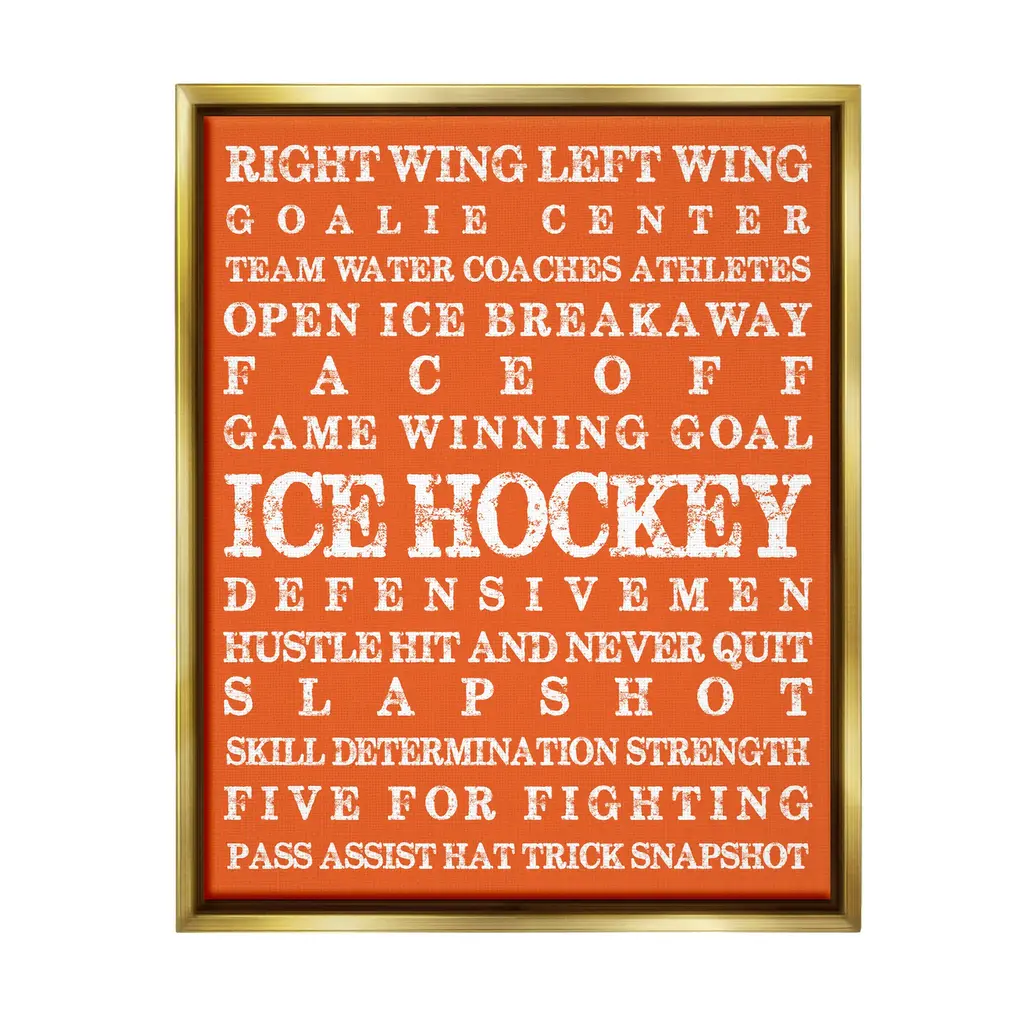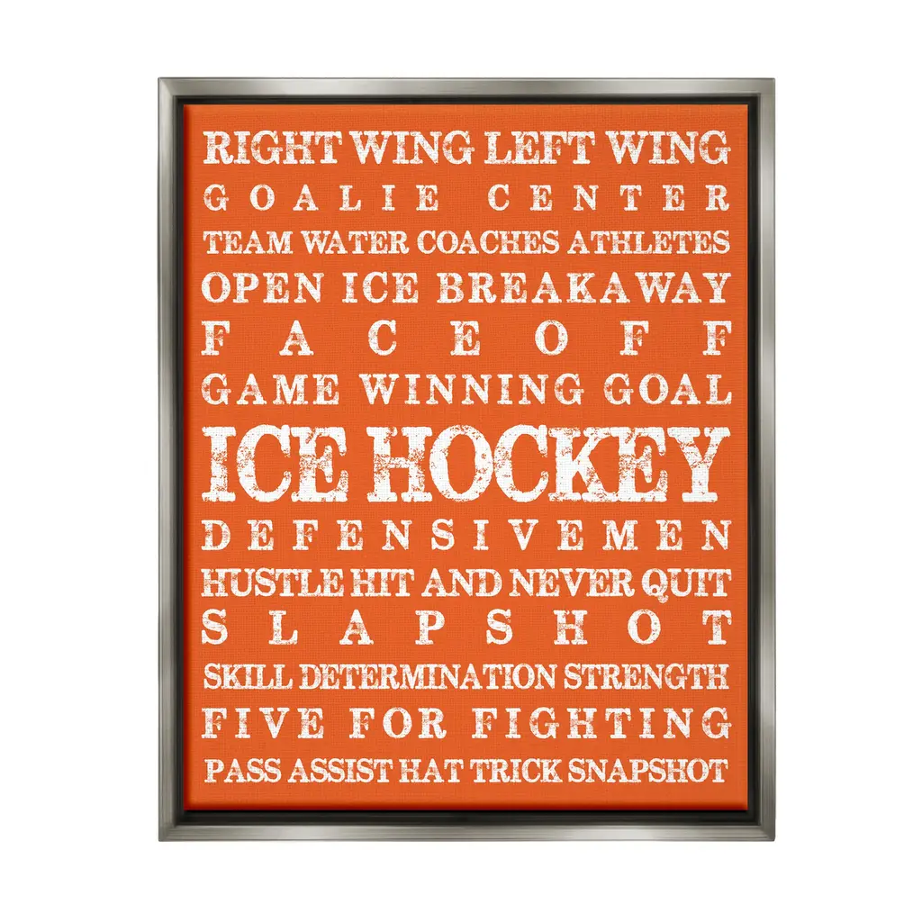 Elevate your home or office to the next level with Stupell Framed Floating Canvas Wall Art. Our premium hand-stretched canvas is mounted securely into a sturdy lightweight frame. The museum-style gap between the wrapped canvas and the box frame gives the illusion of floating artwork. Stupell Wall Art is made in the USA.Features: Dimensions: 17 x 1.7 x 21 Frame, 16 x 1.5 x 20 Canvas ArtFloating Frame Canvas Products are available in sizes 17"x21" and 25"x31". All Floating Frame Canvas Products have a 1.7" Depth.Wall Art is Ready to Hang with Hardware Free Hanging. No Installation required. For Easy Set Up Lean or Layer Artwork on Shelf or Against Wall. Artwork is Permently Fixed into the Frame.Our elevated 1.7" Thick Floating Frame is the perfect complement to our canvas style Wall Art. We use only the highest quality inks in house with industry leading printing solutions. Canvas is hand stretched over a durable wood foundation and then mounted securly into a Modern Box Frame. Made in the USA.Artwork Relates To: Helmet, Sport, Hockey, Ice Hockey, Puck, Hockey Stick, VintageDesign by Melody Hogan