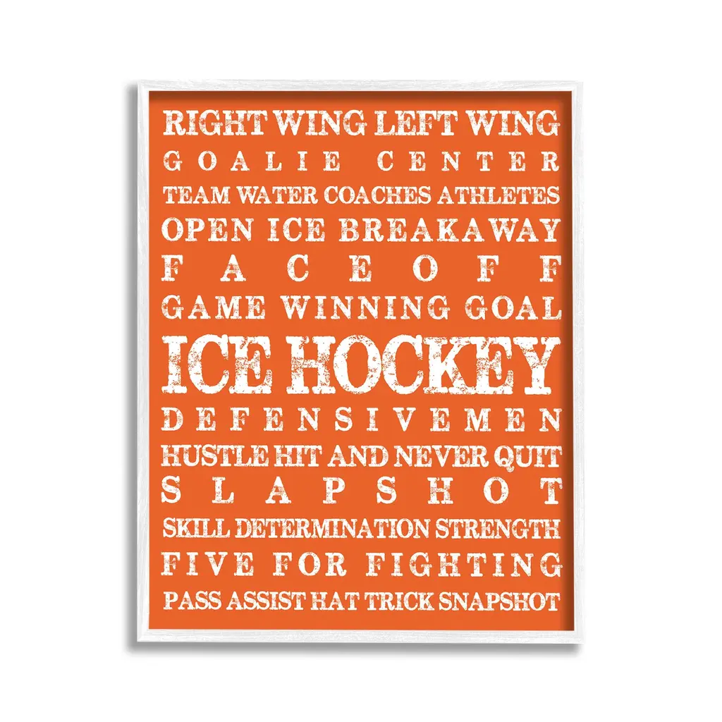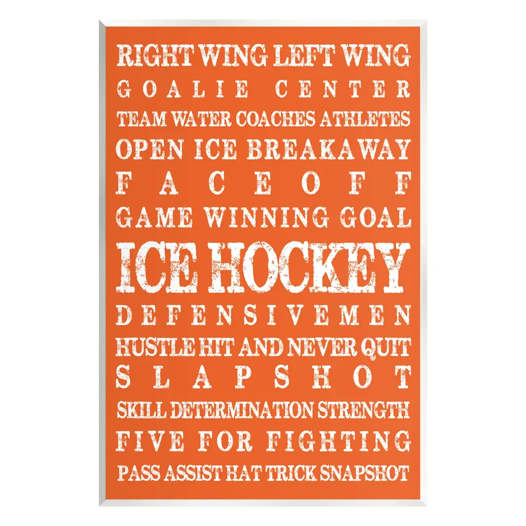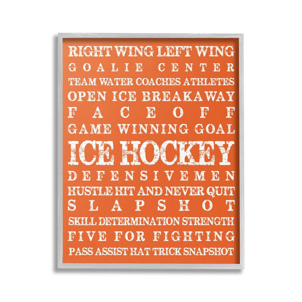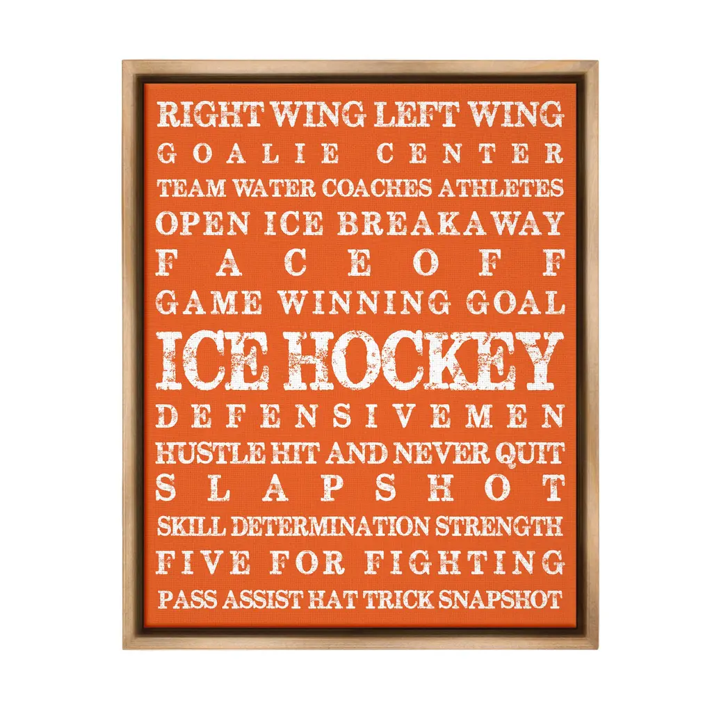 Elevate your home or office to the next level with Stupell Framed Floating Canvas Wall Art. Our premium hand-stretched canvas is mounted securely into a sturdy lightweight frame. The museum-style gap between the wrapped canvas and the box frame gives the illusion of floating artwork. Stupell Wall Art is made in the USA.Features: Dimensions: 17 x 1.7 x 21 Frame, 16 x 1.5 x 20 Canvas ArtFloating Frame Canvas Products are available in sizes 17"x21" and 25"x31". All Floating Frame Canvas Products have a 1.7" Depth.Wall Art is Ready to Hang with Hardware Free Hanging. No Installation required. For Easy Set Up Lean or Layer Artwork on Shelf or Against Wall. Artwork is Permently Fixed into the Frame.Our elevated 1.7" Thick Floating Frame is the perfect complement to our canvas style Wall Art. We use only the highest quality inks in house with industry leading printing solutions. Canvas is hand stretched over a durable wood foundation and then mounted securly into a Modern Box Frame. Made in the USA.Artwork Relates To: Helmet, Sport, Hockey, Ice Hockey, Puck, Hockey Stick, VintageDesign by Melody Hogan