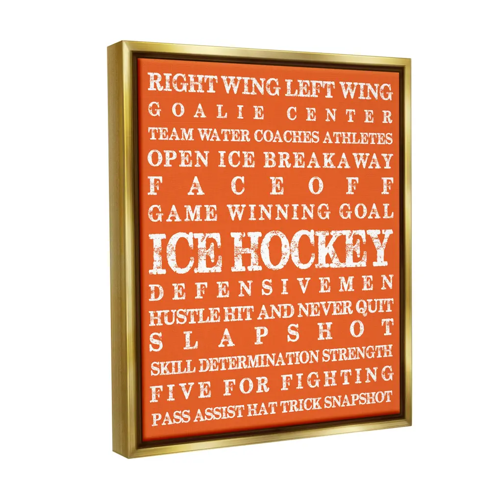 Elevate your home or office to the next level with Stupell Framed Floating Canvas Wall Art. Our premium hand-stretched canvas is mounted securely into a sturdy lightweight frame. The museum-style gap between the wrapped canvas and the box frame gives the illusion of floating artwork. Stupell Wall Art is made in the USA.Features: Dimensions: 17 x 1.7 x 21 Frame, 16 x 1.5 x 20 Canvas ArtFloating Frame Canvas Products are available in sizes 17"x21" and 25"x31". All Floating Frame Canvas Products have a 1.7" Depth.Wall Art is Ready to Hang with Hardware Free Hanging. No Installation required. For Easy Set Up Lean or Layer Artwork on Shelf or Against Wall. Artwork is Permently Fixed into the Frame.Our elevated 1.7" Thick Floating Frame is the perfect complement to our canvas style Wall Art. We use only the highest quality inks in house with industry leading printing solutions. Canvas is hand stretched over a durable wood foundation and then mounted securly into a Modern Box Frame. Made in the USA.Artwork Relates To: Helmet, Sport, Hockey, Ice Hockey, Puck, Hockey Stick, VintageDesign by Melody Hogan