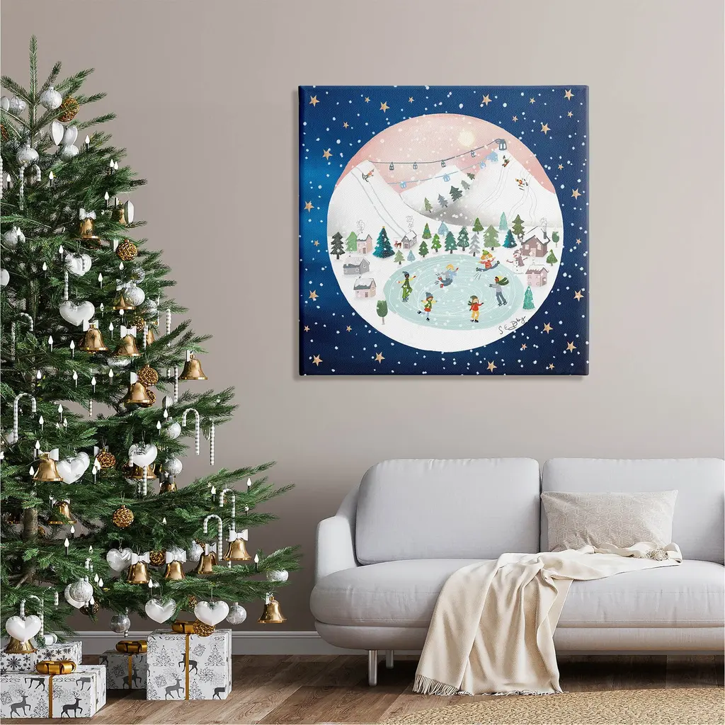 We create our stretched canvas to the highest standards. Using only the highest quality inks and canvas on Mimaki printers, we hand-cut and stretch each piece over a 1.5-inch thick wooden frame for hanging. As a result, the art comes ready to hang on the sturdy ledge with no installation required. Stupell Wall Art is made in the USA.Features: Dimensions: 17 x 1.5 x 17 InchesStretched Canvas Sizes Include Standard: 17 x 1.5 x 17 Large: 24 x 1.5 x 24 X-Large: 30 x 1.5 x 30 Oversized: 36 x 1.5 x 36Wall Art is Ready to Hang - No Installation or Hardware Needed. For Easy Set Up Lean or Layer Artwork on Shelf or Against Wall.Our stretched canvas is created with the highest standards. We use only the highest quality inks and canvas on our in house Mimaki printers, and then hand cut and stretch each piece over a 1.5 inch thick wooden frame for hanging. Made In USA.Artwork Relates To: People, Nature, Christmas, Ice Skating, Snow, Christmas Tree, Winter, StarsDesign by Lemon & Sugar