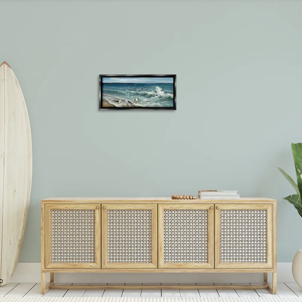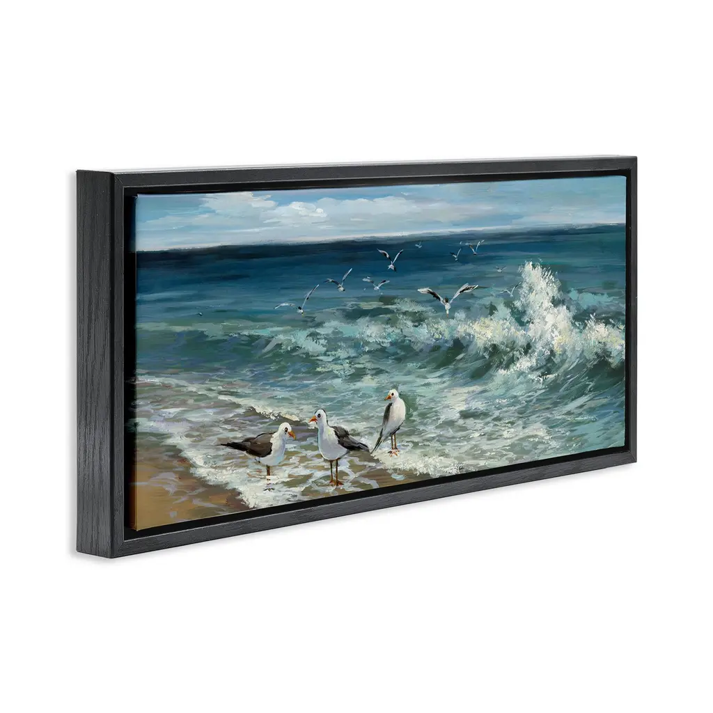 Elevate your home or office to the next level with Stupell Framed Floating Canvas Wall Art. Our premium hand-stretched canvas is mounted securely into a sturdy lightweight frame. The museum-style gap between the wrapped canvas and the box frame gives the illusion of floating artwork. Stupell Wall Art is made in the USA.Features: Dimensions: 25 x 1.7 x 11 Frame, 24 x 1.5 x 10 Canvas ArtFloating Frame Canvas Products are available in sizes 25"x11" and 31"x14". All Floating Frame Canvas Products have a 1.7" Depth.Wall Art is Ready to Hang with Hardware Free Hanging. No Installation required. For Easy Set Up Lean or Layer Artwork on Shelf or Against Wall. Artwork is Permently Fixed into the Frame.Our elevated 1.7" Thick Floating Frame is the perfect complement to our canvas style Wall Art. We use only the highest quality inks in house with industry leading printing solutions. Canvas is hand stretched over a durable wood foundation and then mounted securly into a Modern Box Frame. Made in the USA.Artwork Relates To: Nautical, Beach, Shore, Coast, Landscape, Waves, Bird, SeagullDesign by Heather Hayes