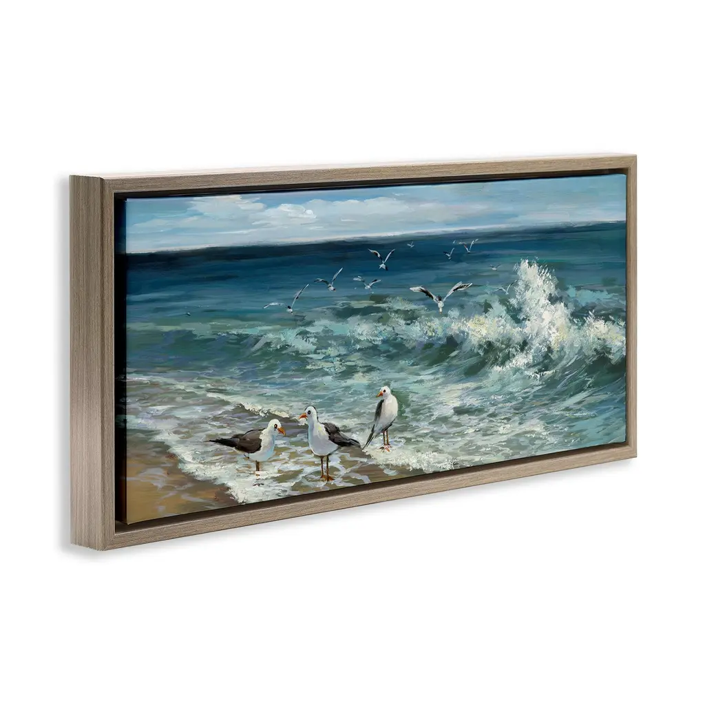 Elevate your home or office to the next level with Stupell Framed Floating Canvas Wall Art. Our premium hand-stretched canvas is mounted securely into a sturdy lightweight frame. The museum-style gap between the wrapped canvas and the box frame gives the illusion of floating artwork. Stupell Wall Art is made in the USA.Features: Dimensions: 25 x 1.7 x 11 Frame, 24 x 1.5 x 10 Canvas ArtFloating Frame Canvas Products are available in sizes 25"x11" and 31"x14". All Floating Frame Canvas Products have a 1.7" Depth.Wall Art is Ready to Hang with Hardware Free Hanging. No Installation required. For Easy Set Up Lean or Layer Artwork on Shelf or Against Wall. Artwork is Permently Fixed into the Frame.Our elevated 1.7" Thick Floating Frame is the perfect complement to our canvas style Wall Art. We use only the highest quality inks in house with industry leading printing solutions. Canvas is hand stretched over a durable wood foundation and then mounted securly into a Modern Box Frame. Made in the USA.Artwork Relates To: Nautical, Beach, Shore, Coast, Landscape, Waves, Bird, SeagullDesign by Heather Hayes