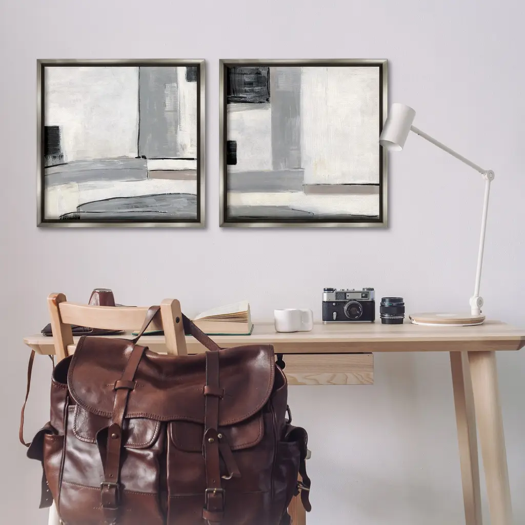 Elevate your home or office to the next level with Stupell Framed Floating Canvas Wall Art. Our premium hand-stretched canvas is mounted securely into a sturdy lightweight frame. The museum-style gap between the wrapped canvas and the box frame gives the illusion of floating artwork. Stupell Wall Art is made in the USA.Features: Dimensions: 2 Piece Set, Each Frame is 18 x 1.7 x 18Two Piece Floating Frame Canvas Products are available as 18"x18" or 25"x25" Panels. All Floating Frame Canvas Products have a 1.7" Depth.Wall Art is Ready to Hang with Hardware Free Hanging. No Installation required. For Easy Set Up Lean or Layer Artwork on Shelf or Against Wall. Artwork is Permently Fixed into the Frame.Our elevated 1.7" Thick Floating Frame is the perfect complement to our canvas style Wall Art. We use only the highest quality inks in house with industry leading printing solutions. Canvas is hand stretched over a durable wood foundation and then mounted securly into a Modern Box Frame. Made in the USA.Artwork Relates To: Painting, Modern, Urban, Abstract, GeometricDesign by Sally Swatland