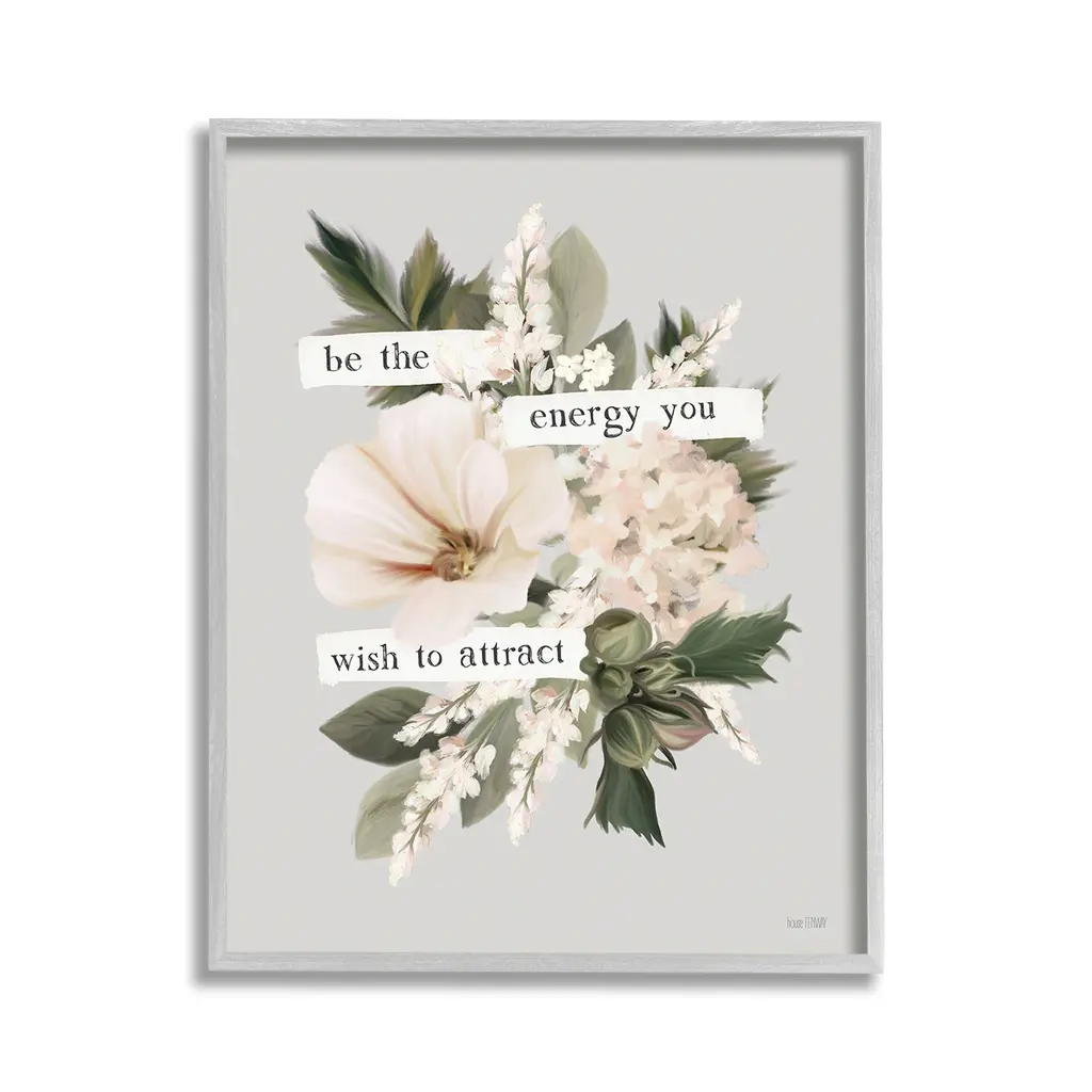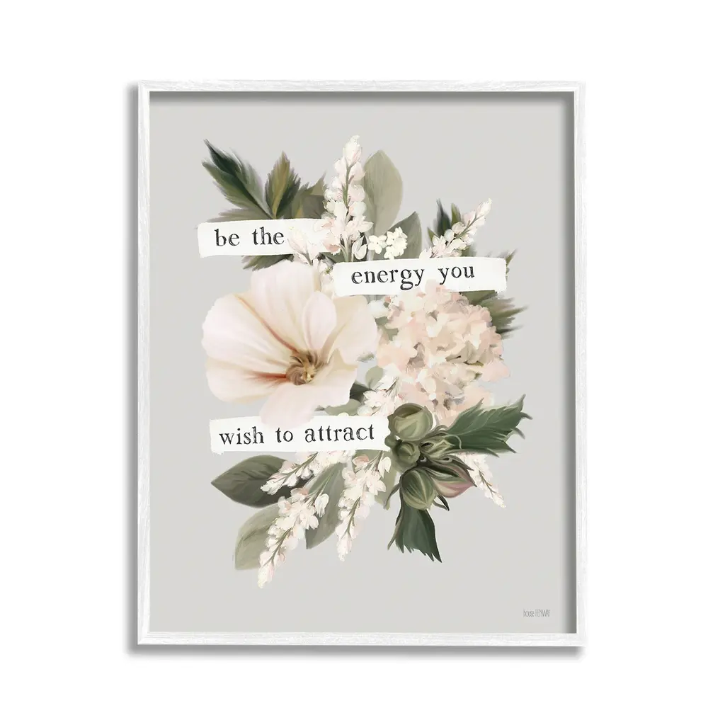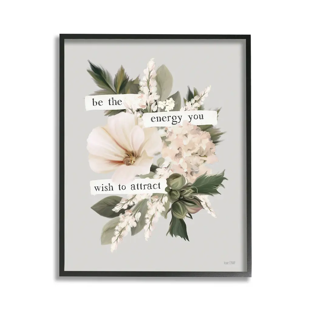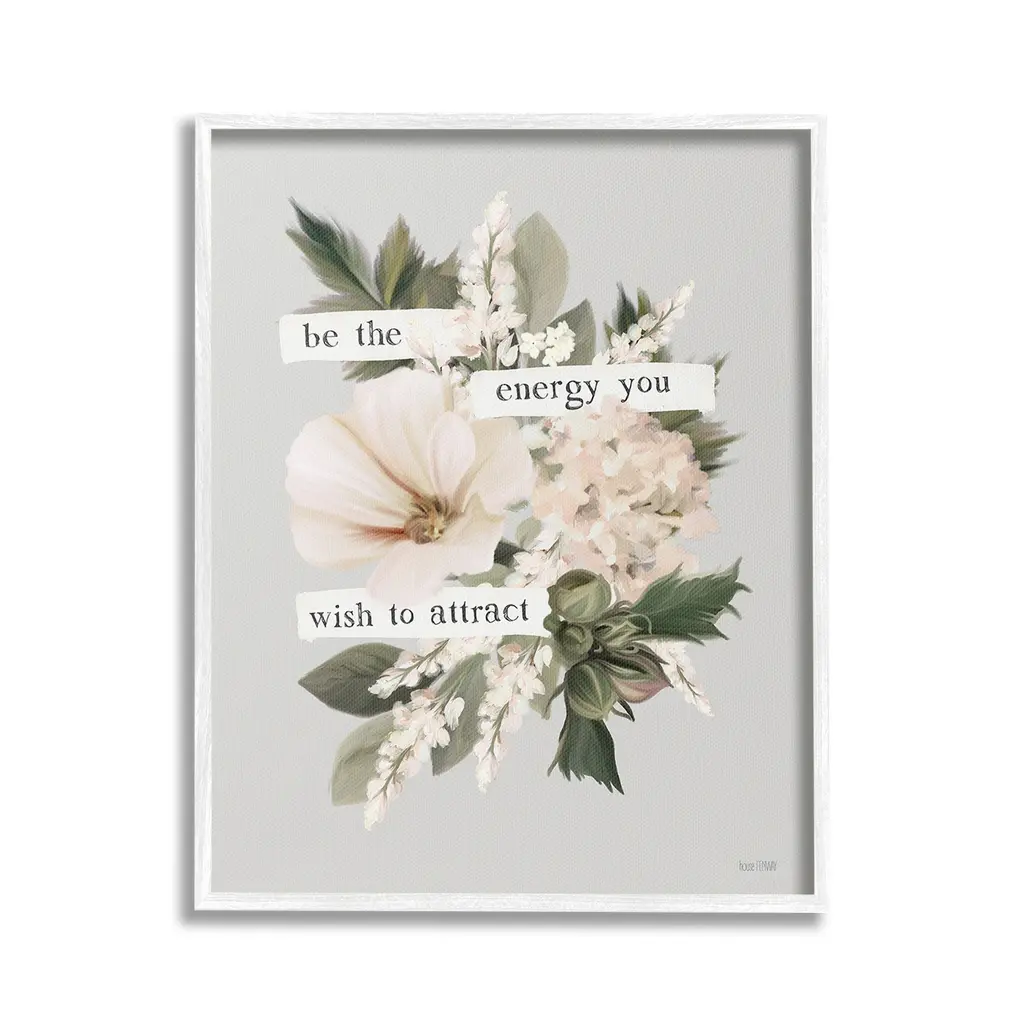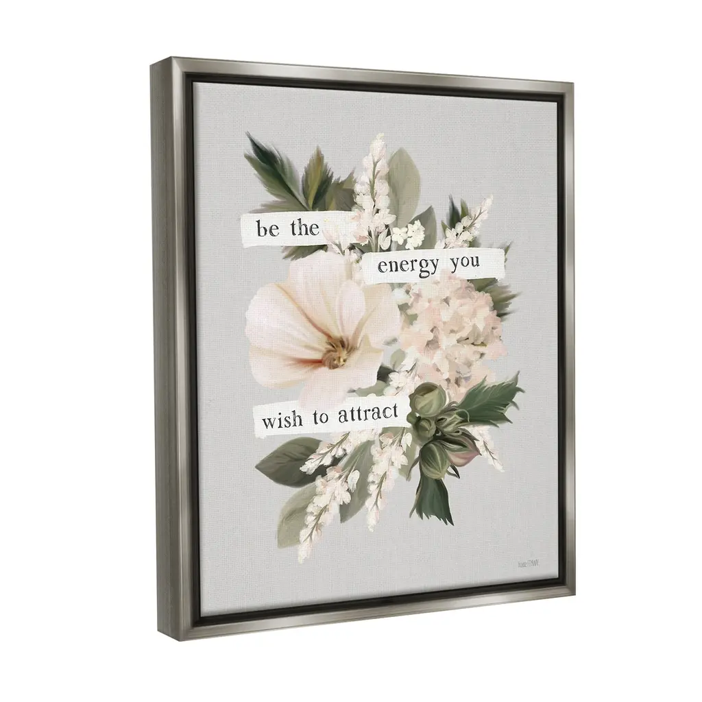 Elevate your home or office to the next level with Stupell Framed Floating Canvas Wall Art. Our premium hand-stretched canvas is mounted securely into a sturdy lightweight frame. The museum-style gap between the wrapped canvas and the box frame gives the illusion of floating artwork. Stupell Wall Art is made in the USA.Features: Dimensions: 17 x 1.7 x 21 Frame, 16 x 1.5 x 20 Canvas ArtFloating Frame Canvas Products are available in sizes 17"x21" and 25"x31". All Floating Frame Canvas Products have a 1.7" Depth.Wall Art is Ready to Hang with Hardware Free Hanging. No Installation required. For Easy Set Up Lean or Layer Artwork on Shelf or Against Wall. Artwork is Permently Fixed into the Frame.Our elevated 1.7" Thick Floating Frame is the perfect complement to our canvas style Wall Art. We use only the highest quality inks in house with industry leading printing solutions. Canvas is hand stretched over a durable wood foundation and then mounted securly into a Modern Box Frame. Made in the USA.Artwork Relates To: Floral, Flower, Border, Blossom, Cottage, Phrase, Vintage, Inspirational, Be The Energy You Wish To AttractDesign by House Fenway