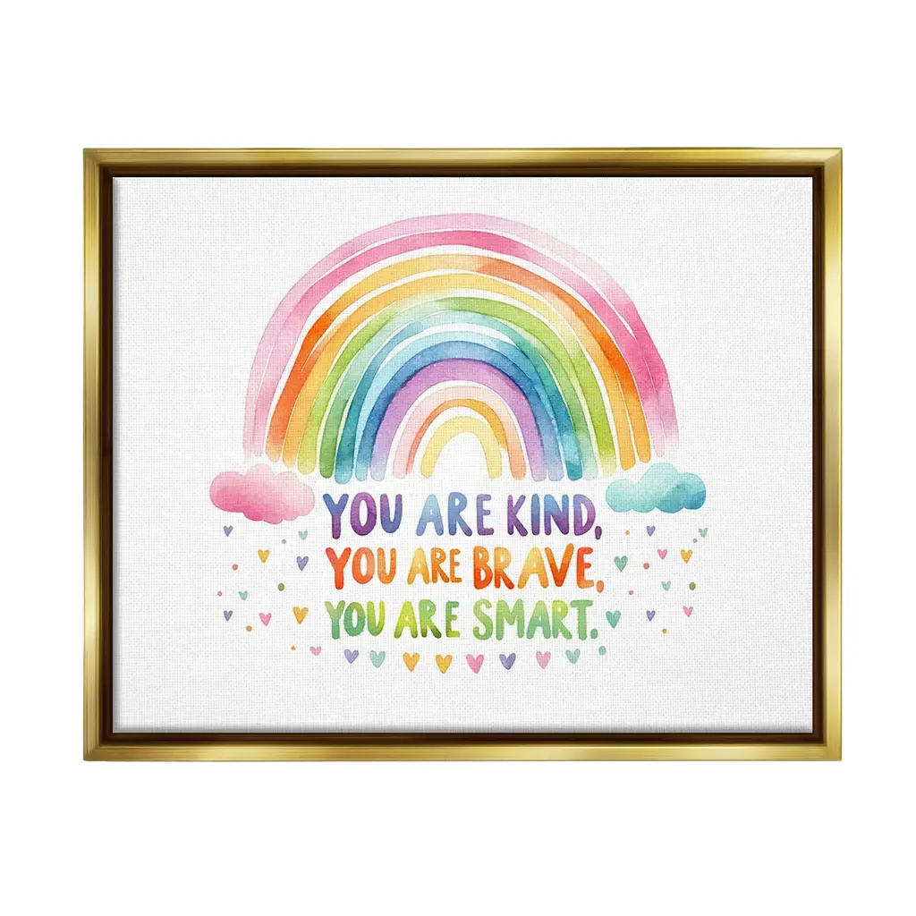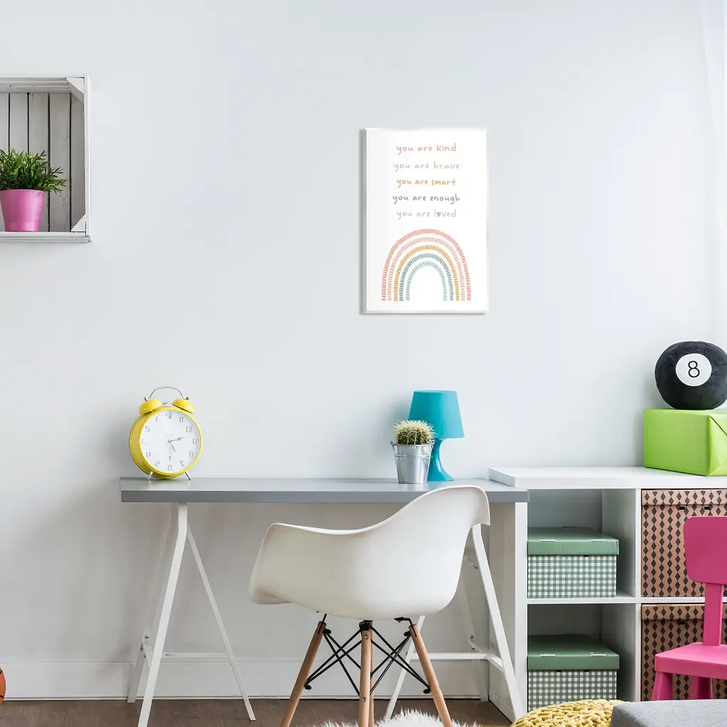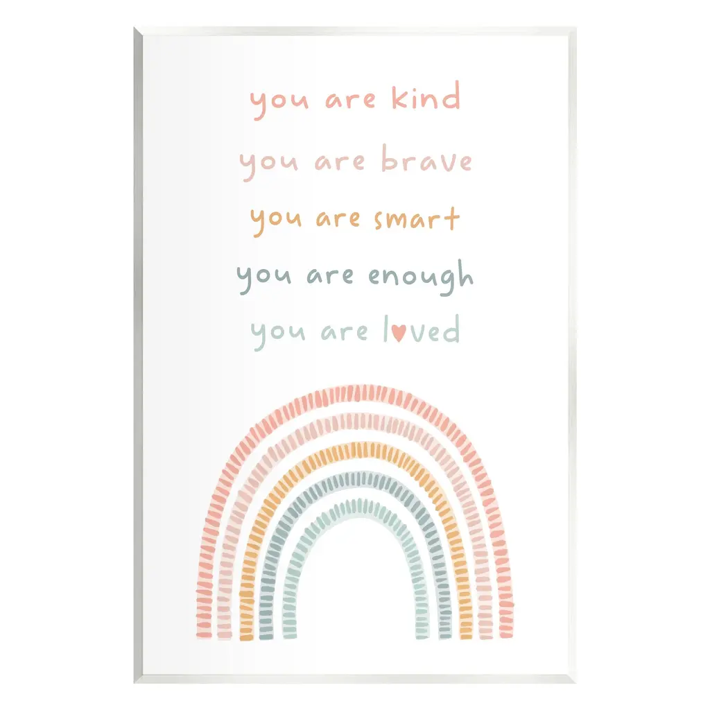 Our wall plaques start as high-quality lithograph prints mounted on durable 0.5-inch thick MDF wood. Each piece is hand finished and comes with a fresh layer of white foil on the sides to give it a crisp, clean look. Plaques arrive ready to hang without installation and come with removable plastic corners to keep them from damage in transit. Wall Art is made in the USA.Features: Dimensions: 10 x 0.5 x 15 InchesWall Plaque Sizes Include Standard: 10 x 0.5 x 15 Oversized: 13 x 0.5 x 19Wall Art is Ready to Hang with Hardware Free Hanging. No installation required. For Easy Set Up Lean or Layer Artwork on Shelf or Against Wall.All of our wall plaques start off as high quality lithograph prints that are then mounted on durable 0.5 inch thick MDF wood. Each piece is hand finished and comes with a fresh layer of foil on the sides to give it a crisp clean look. Made In USA.Artwork Relates To: Rainbow, Pastel, Uplifting, Inspirational, You are kind, you are brave, you are smart, you are enough, you are lovedDesign by Lil' Rue