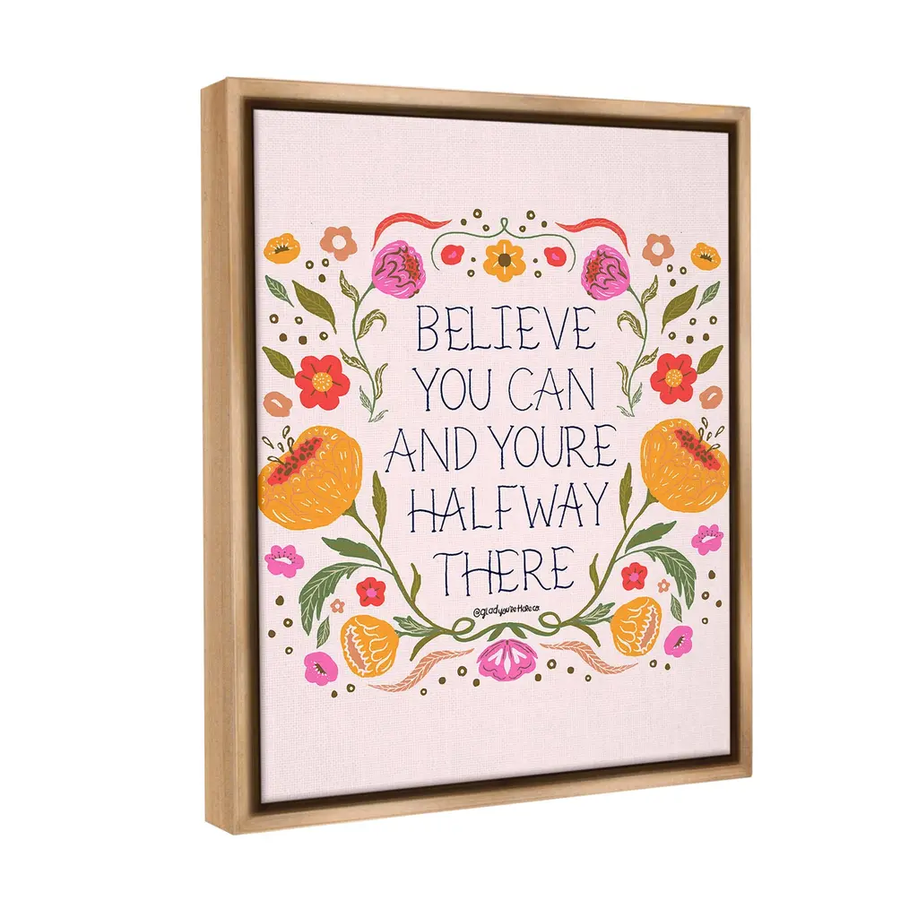Elevate your home or office to the next level with Stupell Framed Floating Canvas Wall Art. Our premium hand-stretched canvas is mounted securely into a sturdy lightweight frame. The museum-style gap between the wrapped canvas and the box frame gives the illusion of floating artwork. Stupell Wall Art is made in the USA.Features: Dimensions: 17 x 1.7 x 21 Frame, 16 x 1.5 x 20 Canvas ArtFloating Frame Canvas Products are available in sizes 17"x21" and 25"x31". All Floating Frame Canvas Products have a 1.7" Depth.Wall Art is Ready to Hang with Hardware Free Hanging. No Installation required. For Easy Set Up Lean or Layer Artwork on Shelf or Against Wall. Artwork is Permently Fixed into the Frame.Our elevated 1.7" Thick Floating Frame is the perfect complement to our canvas style Wall Art. We use only the highest quality inks in house with industry leading printing solutions. Canvas is hand stretched over a durable wood foundation and then mounted securly into a Modern Box Frame. Made in the USA.Artwork Relates To: Floral, Flower, Pattern, Botanical, Plant, Inspirational, Believe You Can and You're Halfway ThereDesign by Glad You're Here Co.