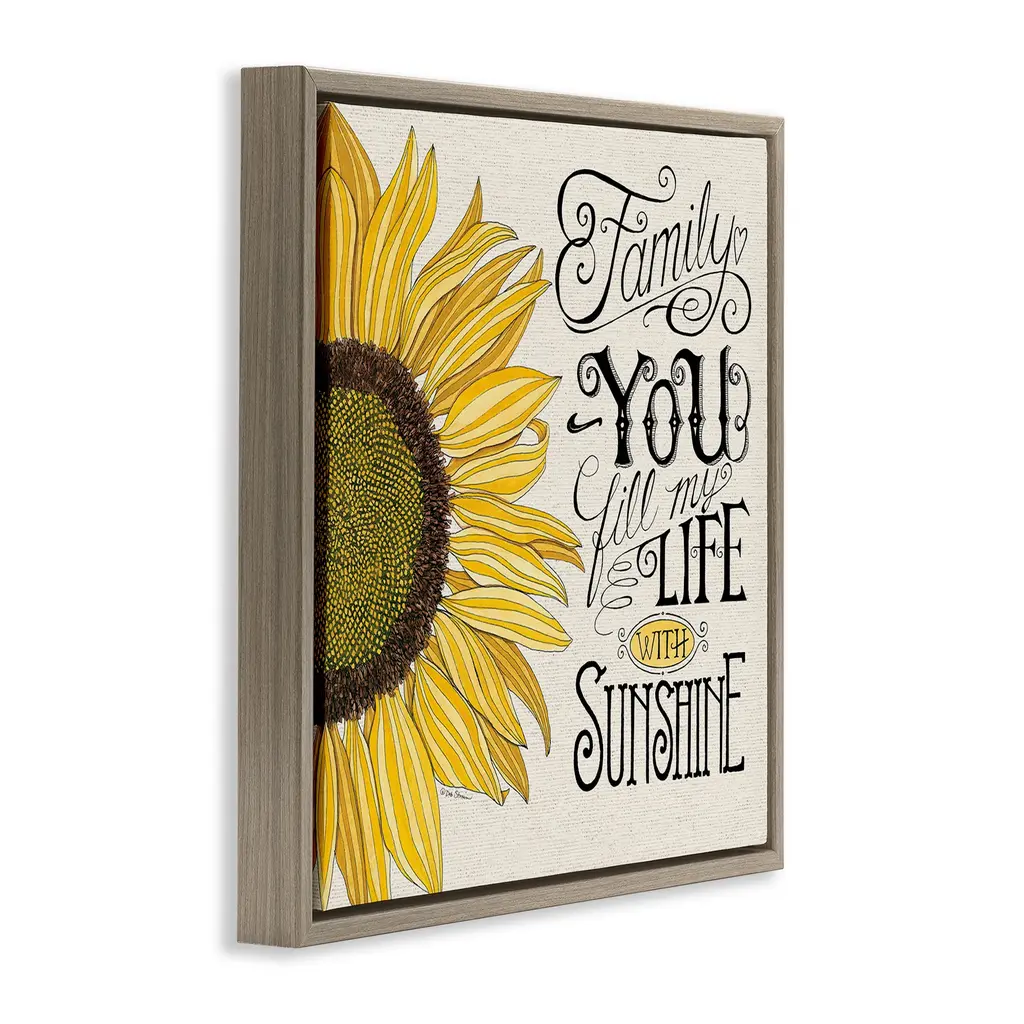 Elevate your home or office to the next level with Stupell Framed Floating Canvas Wall Art. Our premium hand-stretched canvas is mounted securely into a sturdy lightweight frame. The museum-style gap between the wrapped canvas and the box frame gives the illusion of floating artwork. Stupell Wall Art is made in the USA.Features: Dimensions: 18 x 1.7 x 18 Frame, 17 x 1.5 x 17 Canvas ArtFloating Frame Canvas Products are available in sizes 18"x18" and 25"x25". All Floating Frame Canvas Products have a 1.7" Depth.Wall Art is Ready to Hang with Hardware Free Hanging. No Installation required. For Easy Set Up Lean or Layer Artwork on Shelf or Against Wall. Artwork is Permently Fixed into the Frame.Our elevated 1.7" Thick Floating Frame is the perfect complement to our canvas style Wall Art. We use only the highest quality inks in house with industry leading printing solutions. Canvas is hand stretched over a durable wood foundation and then mounted securly into a Modern Box Frame. Made in the USA.Artwork Relates To: Phrase, Family, Flower, Floral, Sunflower, Vintage, Love, CountryDesign by Deb Strain